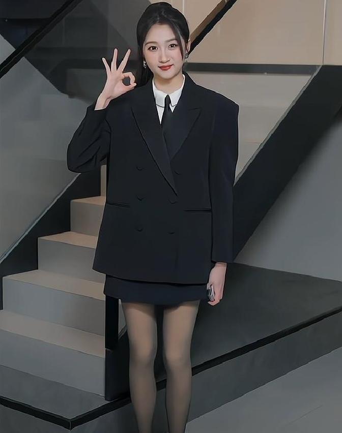 她本来就有一米七二多的身高优势,腿占了快大半个身子,加上比例好、线条直,这次换上黑色丝袜,直接把这一点放大到极致。不是那种刻意露肤的路线,而是用穿搭把气质拉满:小黑裙搭黑丝,整个人显得利落又有点贵气;宽松西装配黑丝,反差感一下出来了,既有少年感,又带点酷飒气场;白衬衫加黑丝,看着干净清爽,又多了几分若有若无的性感。