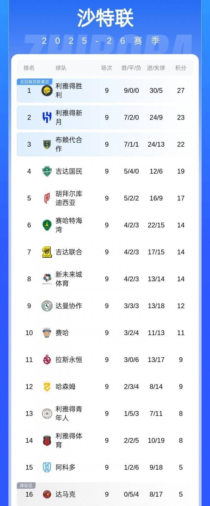 九连胜、强势领跑 沙特联第九轮,利雅得胜利坐镇主场迎战来访的赛哈特海湾,菲利克斯传射建功、C罗倒钩破门,胜利主场4-1大胜对手,迎来联赛九连胜,四分优势领跑积分榜! 在无缘沙超杯冠军、沙王冠不敌吉达联合无缘八强之后,本赛季的利雅得胜利仅剩沙特联和亚冠二级可以争冠,亚冠二级方面,胜利小组赛四连胜晋级在望,联赛这边利雅得胜利开赛九连胜强势领跑,直接竞争对手利雅得新月以7胜2平不败战绩位居次席,卫冕冠军吉达联合4胜2平3负仅排在第七位,落后胜利13分! 本赛季的利雅得胜利在菲利克斯加盟后,球队的进攻火力全开,9轮联赛打进30球,菲利克斯联赛9次出场贡献11球3助攻,而40岁的C罗也有出色表现,9次登场10球1助攻,不过现在说冠军为时过早,毕竟联赛才开始,保持状态吧,加油!