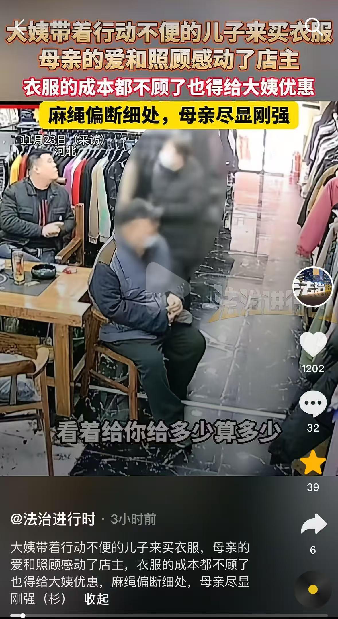 “愿好人一生平安”河北定州,服装店老板吴先生刚整理完店里刚到的棉服坐着玩手机,玻璃门外传来的轮椅轱辘声格外清晰,抬头望去,一位头发花白的大姨正吃力地推着轮椅,轮椅上坐着一位中年男子,起初吴先生并没有在意,只是招呼着其随意看看。 (来源:法治进行时) “老板,能给俺儿子找件合身的棉袄不?”大姨的声音带着些许沙哑,“他今年45了,脑梗后就不能动了,天儿冷,想给他添件暖和的。”说话间,大姨熟练地给儿子掖了掖衣领,吴先生看着这一幕,心里泛起阵阵酸涩,当即拿出一件厚实的棉服,帮着大姨给男子穿上,合身又暖和。 大姨看着这衣服很是满意,大姨小心翼翼地问“这衣服多少钱?”,眼神里满是期待又带着一丝担忧。吴先生看着标签上269元的标价,再看看大姨鬓边的白发和男子依赖的眼神,想起自己母亲平日的操劳,心头一热:“大姨,您看着给就行,想给多少都行”大姨愣了一下,以为自己听错了,连连摆手:“这可不行,做生意都有成本,我不知道你的底价,不能让你吃亏。”吴先生笑着摆手,大姨再三道谢后,推着儿子从店里出去了。 这段暖心的经历被路人拍下传到网上后,很快引发热议,大家既为母爱动容,也为店主的善意点赞。那么从法律的角度如何来看待此件暖心事件呢? 1. 赠与合同的核心界定 《民法典》第六百五十七条规定:“赠与合同是赠与人将自己的财产无偿给予受赠人,受赠人表示接受赠与的合同。”吴先生原本标价269元的棉服,允许大姨“随意支付”,差额部分本质上是吴先生无偿给予大姨母子的财产利益,大姨接受该优惠,双方已形成事实上的赠与合同关系,且因基于帮助残疾人、体恤母爱的道德初衷,属于典型的履行道德义务的赠与。 2. 赠与合同的法律效力 根据《民法典》第六百六十条,具有道德义务性质的赠与合同,赠与人不交付赠与财产的,受赠人可以请求交付。本案中,吴先生主动提出让利,大姨接受赠与,合同已履行完毕,双方的权利义务均已实现。同时,因赠与财产已实际交付,财产权利已转移,符合《民法典》第六百五十九条关于财产转移的相关规定,赠与行为合法有效。 3. 赠与人的权利保障 《民法典》第六百六十六条规定:“赠与人的经济状况显著恶化,严重影响其生产经营或者家庭生活的,可以不再履行赠与义务。”这一规定为善意的赠与人提供了兜底保障,若未来吴先生出现经营困难等特殊情况,对于未履行的赠与义务可依法中止,既保护了善意,也兼顾了公平。 对此,你怎么看? 冬日生活打卡季