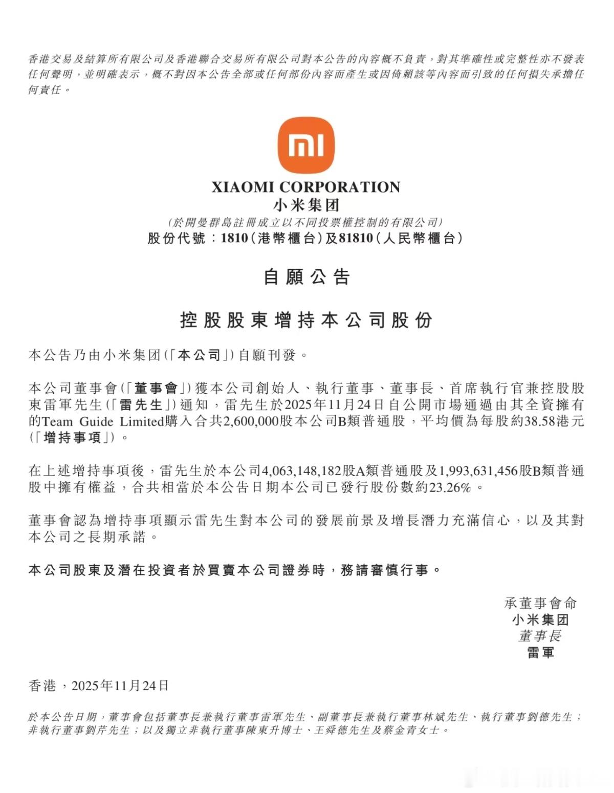 刚刚,小米集团发布公告,雷军宣布增值小米集团股票260万股,对应1亿港币。这应该是小米自IPO以来,创始人雷军首次个人进行二级市场主动增持,既表示对公司未来发展的长期坚定信心,也说明当前小米股价被严重低估。我个人认为,小米近期的大额注销式回购+创始人增持,体现了管理层十足的诚意和护盘意愿。如同我前两天举的例子,投资小米股票类似于和雷军合伙创业,你可能再也找不到比他更好的合伙人了。这也是为什么我反复和投资者朋友们说,投资小米的第一性要素就是雷军个人。理解小米的战略、愿景和价值观,首先要理解雷军的战略、愿景和价值观。你读懂了雷军,也就自然读懂了小米。