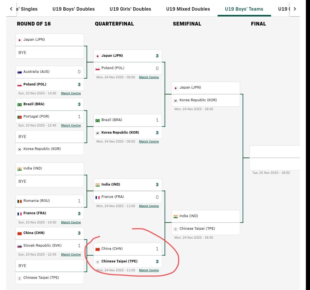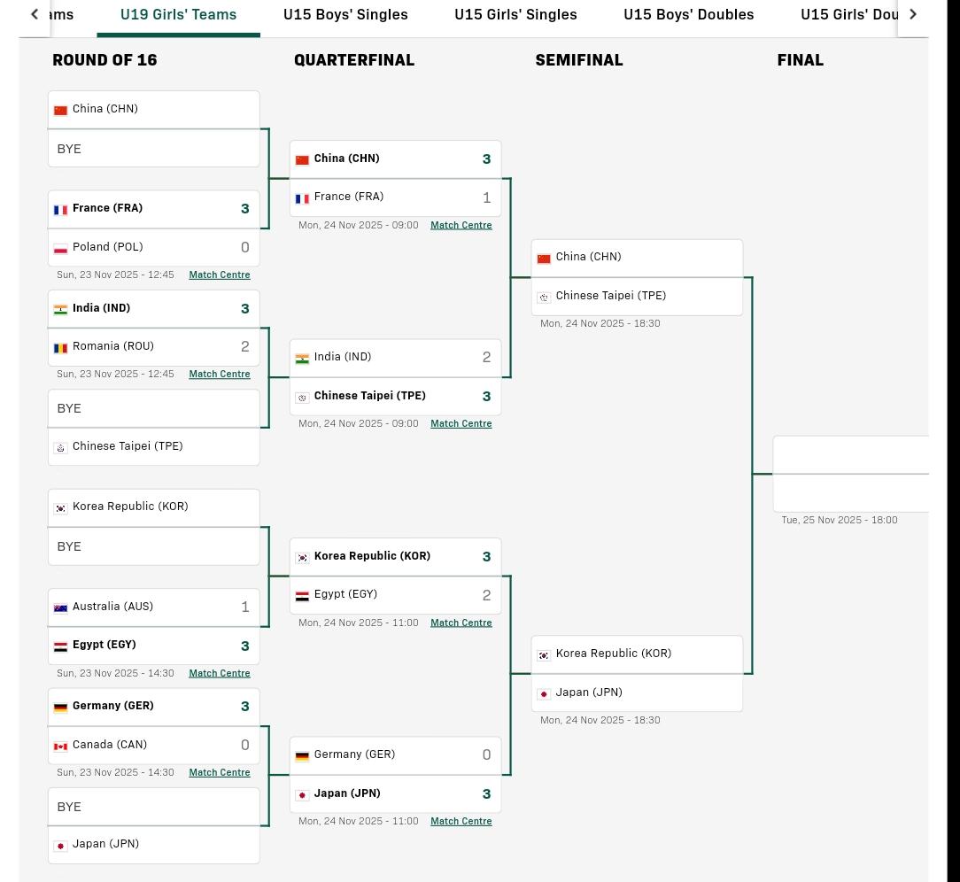 U19男团,国青被淘汰出局了。 1:3输给了省队,止步8强。 这样u19男团4强是,日本、韩国、印度、省队。 另外,u19女团,国青3:1胜法国,进入4强。