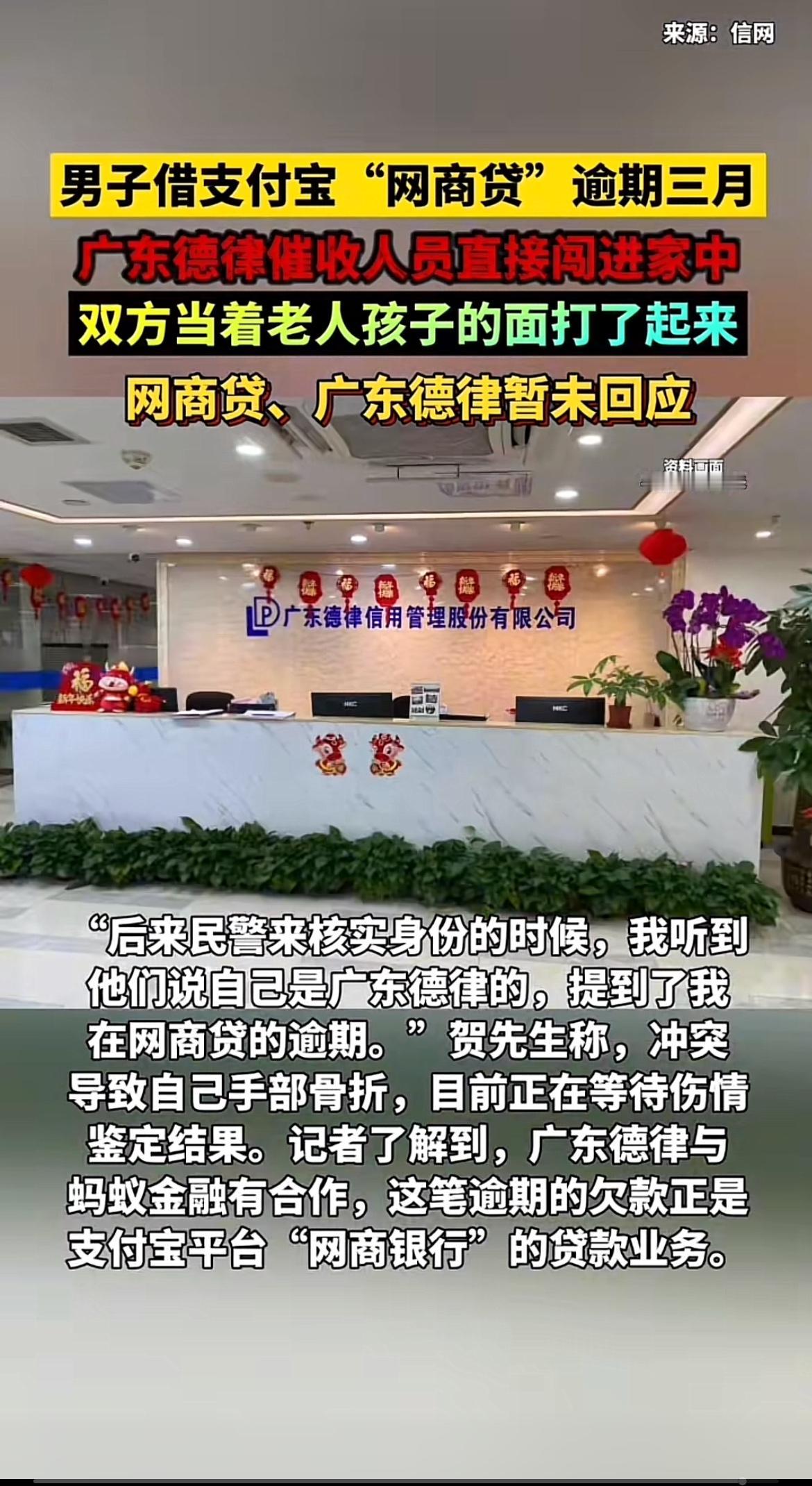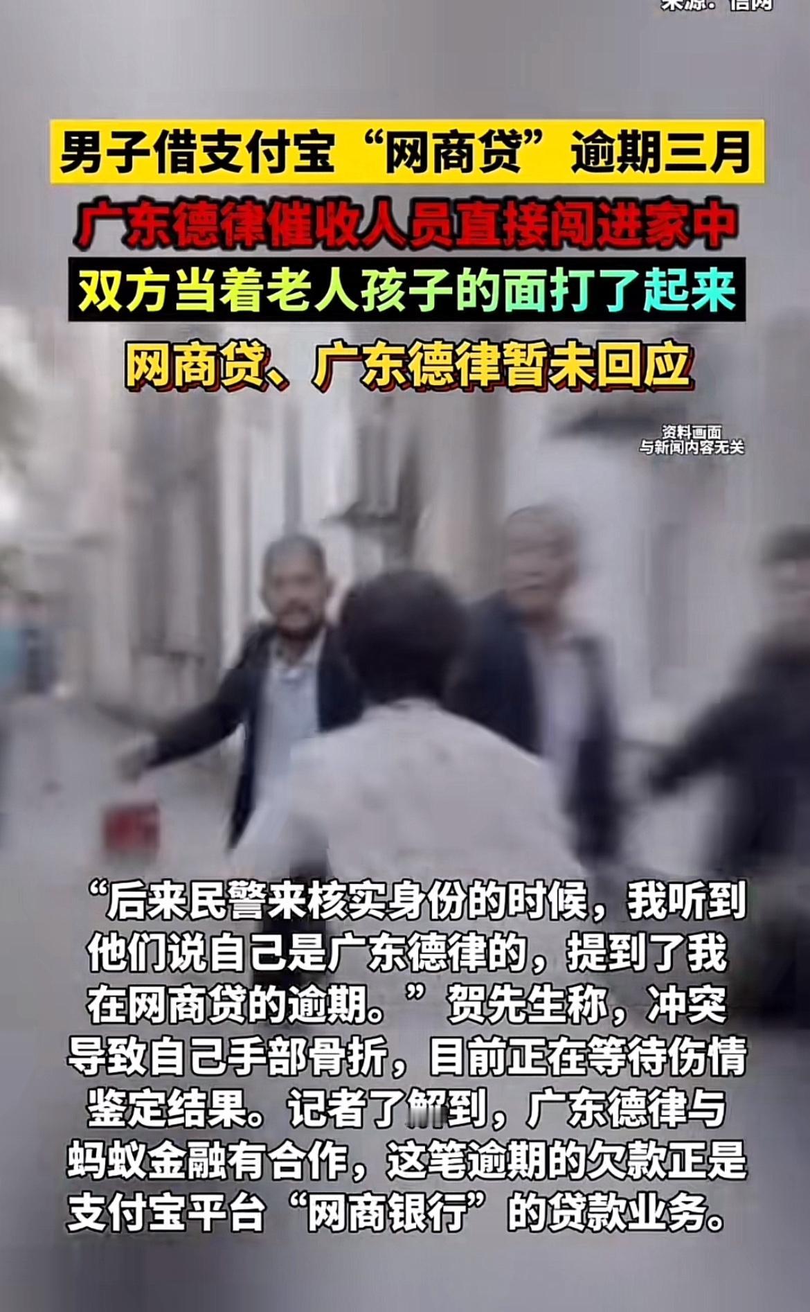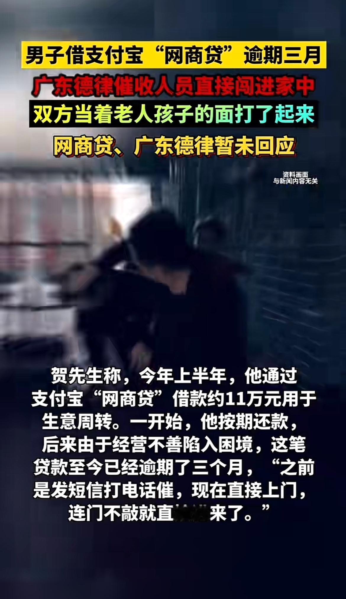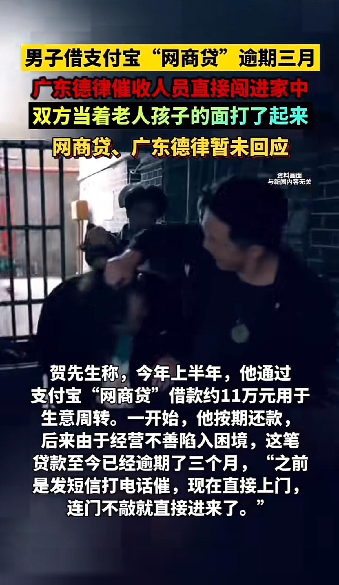 11月8日,河南周口一农村小院里发生了一场冲突。借款人贺先生通过支付宝“网商贷”借了约11万元用于生意周转,可经营不善,贷款逾期三个月。此前催收只是短信电话,这次广东德律的催收人员直接上门,连门都不敲就进来了。当时贺先生母亲、妻子和孩子在院子里,他听到动静出来,催收人员质问他欠款情况。贺先生本在努力筹钱,也希望有缓冲期,结果双方起了冲突,大打出手。这催收方式也太粗暴了,上门讨债也得讲个礼貌和规矩,不然很容易激化矛盾。