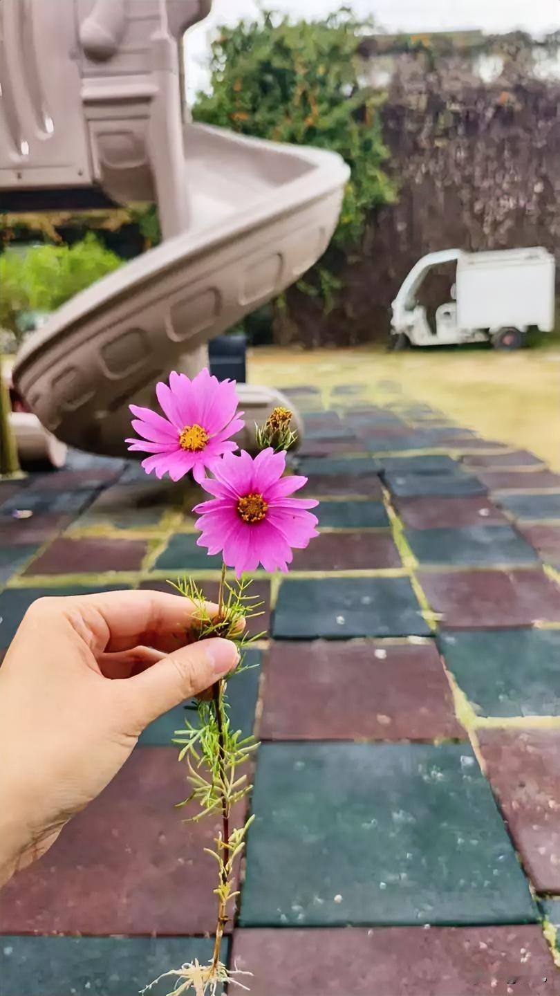 带娃在小区遛弯,眼尖瞅见滑滑梯旁边冒了两朵粉紫小花,细溜溜的杆儿支棱着,花瓣嫩得能掐出水。 蹲下来薅的时候,娃还在旁边喊“妈妈轻点儿!” 攥手里看了好半天,风一吹颤巍巍的,跟小蝴蝶似的。 明明是随便长的野花,偏偏在这橡胶地砖和滑滑梯的堆儿里,开得特招眼——这大概就是“夹缝里的好看”吧! 顺手插兜里,回家给它找个小玻璃瓶供着~