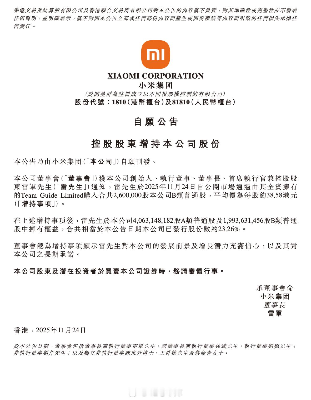 最近小米股价波动比较大,刚刚小米在港交所发布公告,雷军个人斥资超 1 亿港元增持小米集团 260 万股,持股比例增加到了 23.26%。今年以来,小米集团累计回购金额已超 23 亿港币。雷军用回购股票的方式表达对增长的信心,大家对小米有信心吗?