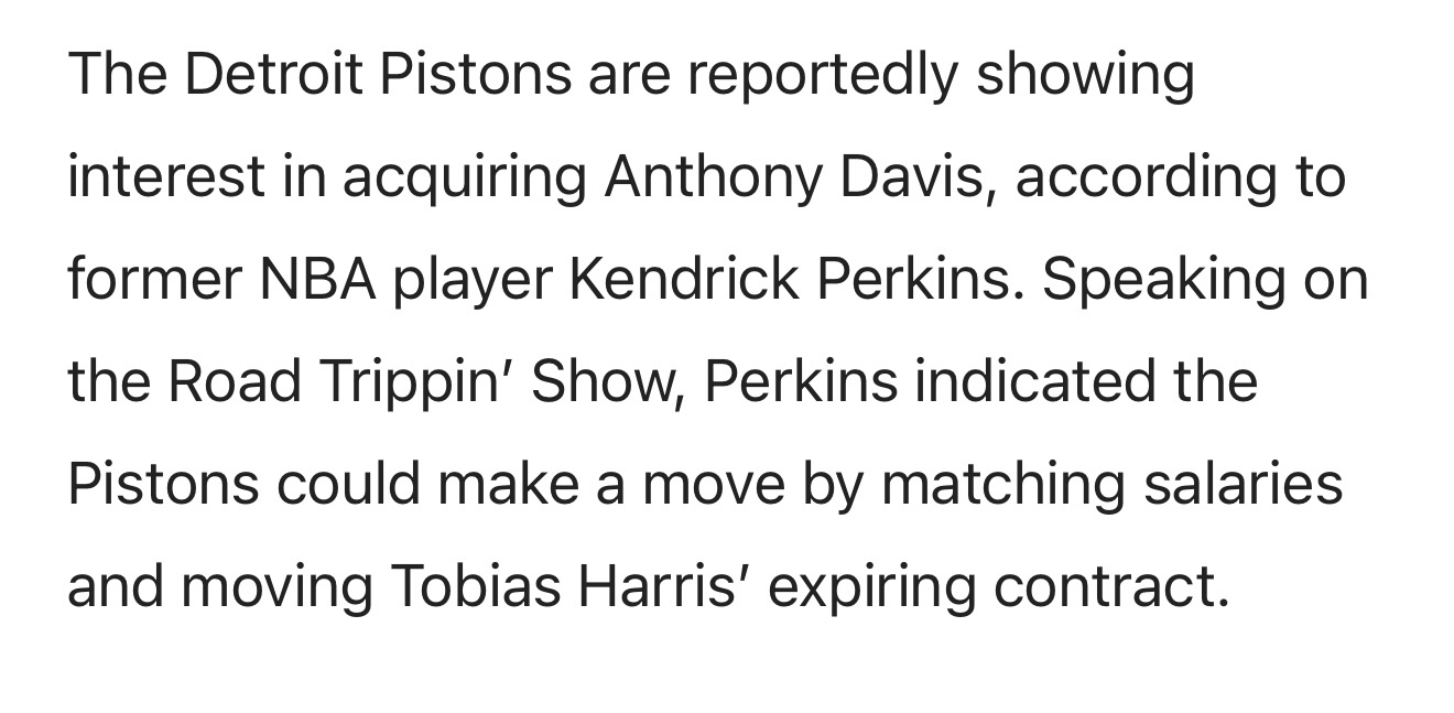 帕金斯表示,底特律活塞有意引进安东尼·戴维斯。活塞队可通过匹配薪资并交易托拜厄斯·哈里斯的到期合同来实现此操作。
