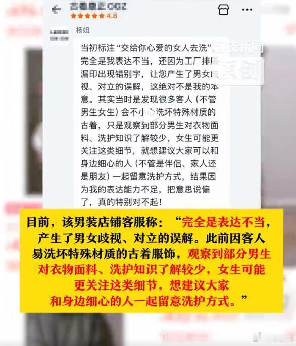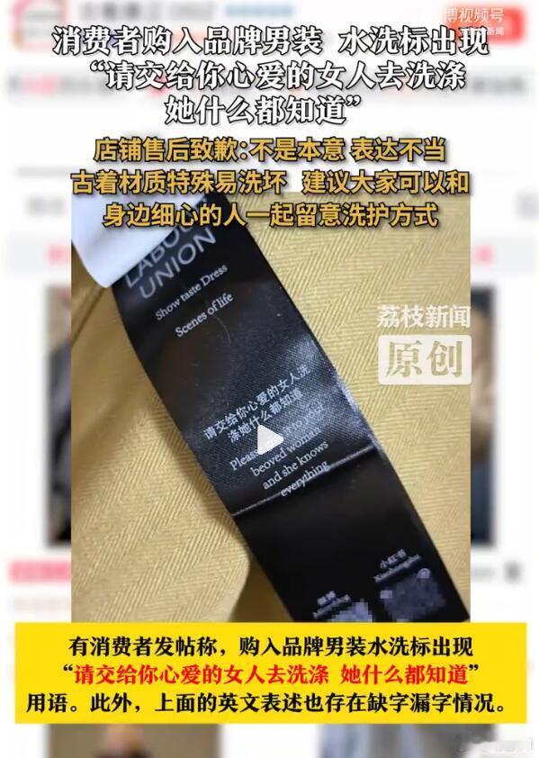 不是,就这句话,“请交给你心爱的女人去洗涤,她什么都知道”,我怎么看不出来有啥歧视女性的嫌疑?明明是在侧面夸赞女性对于纺织品洗涤的细心,懂得各种洗涤方式等等吧?也根本没有凸显出什么大男子主义、家务活儿就得让女性来干的内涵吧?只能说,一些人脑子里烙印着被歧视的思想钢印,看什么都觉得是歧视自己。这是病,得治。