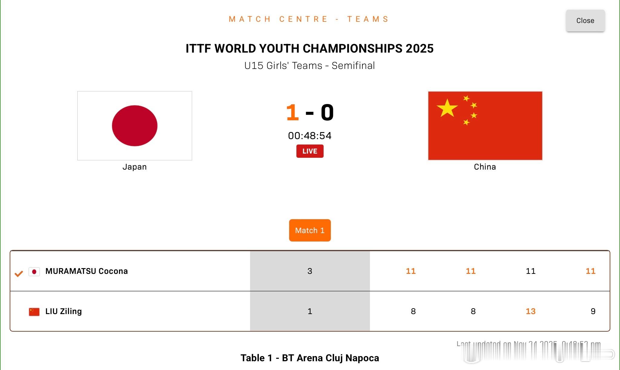 U15女团半决赛🇨🇳中国0-1日本🇯🇵刘子菱1比3村松心菜(8-11、8-11、13-11、9-11)