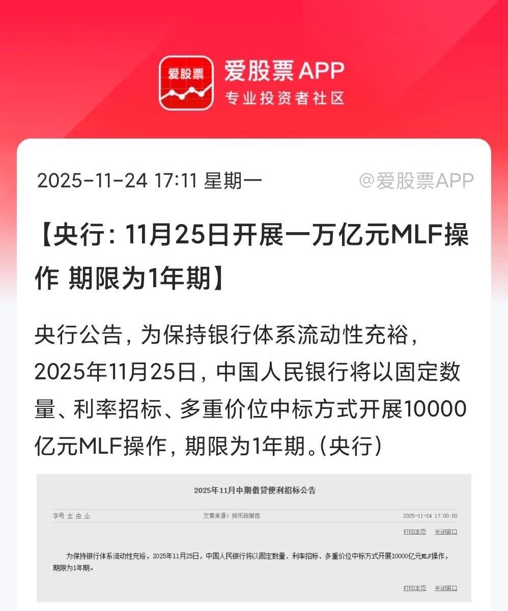老乡别走,央妈带着一万亿增量资金来了!所谓的1万亿的MLF操作,通俗说就是:央妈给银行“发红包”了,1万亿的资金明天到位,银行能用满1年。不过具体利率还没说,明天银行们竞标,谁报的利率合适就给谁钱。总之,1万亿的规模不算小,一是央行想提前给银行备足“弹药”,二是稳住市场情绪,告诉大家流动性管够。这个对A股肯定是积极信号,水牛依然没有变。