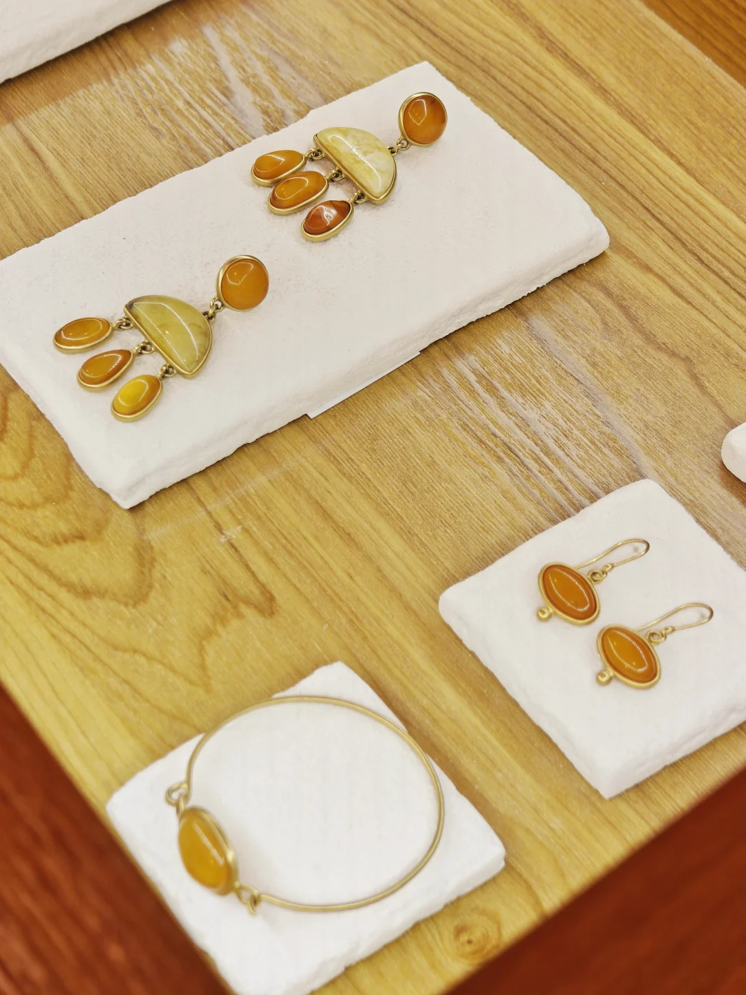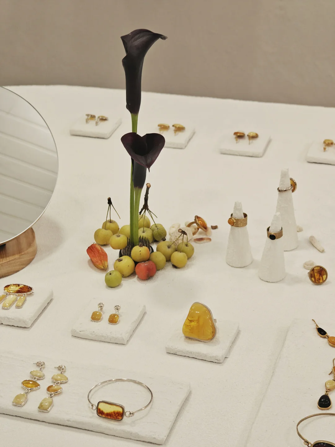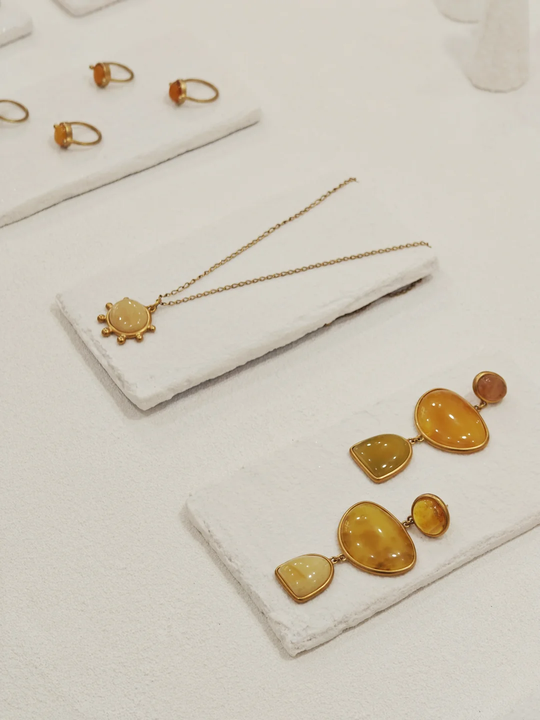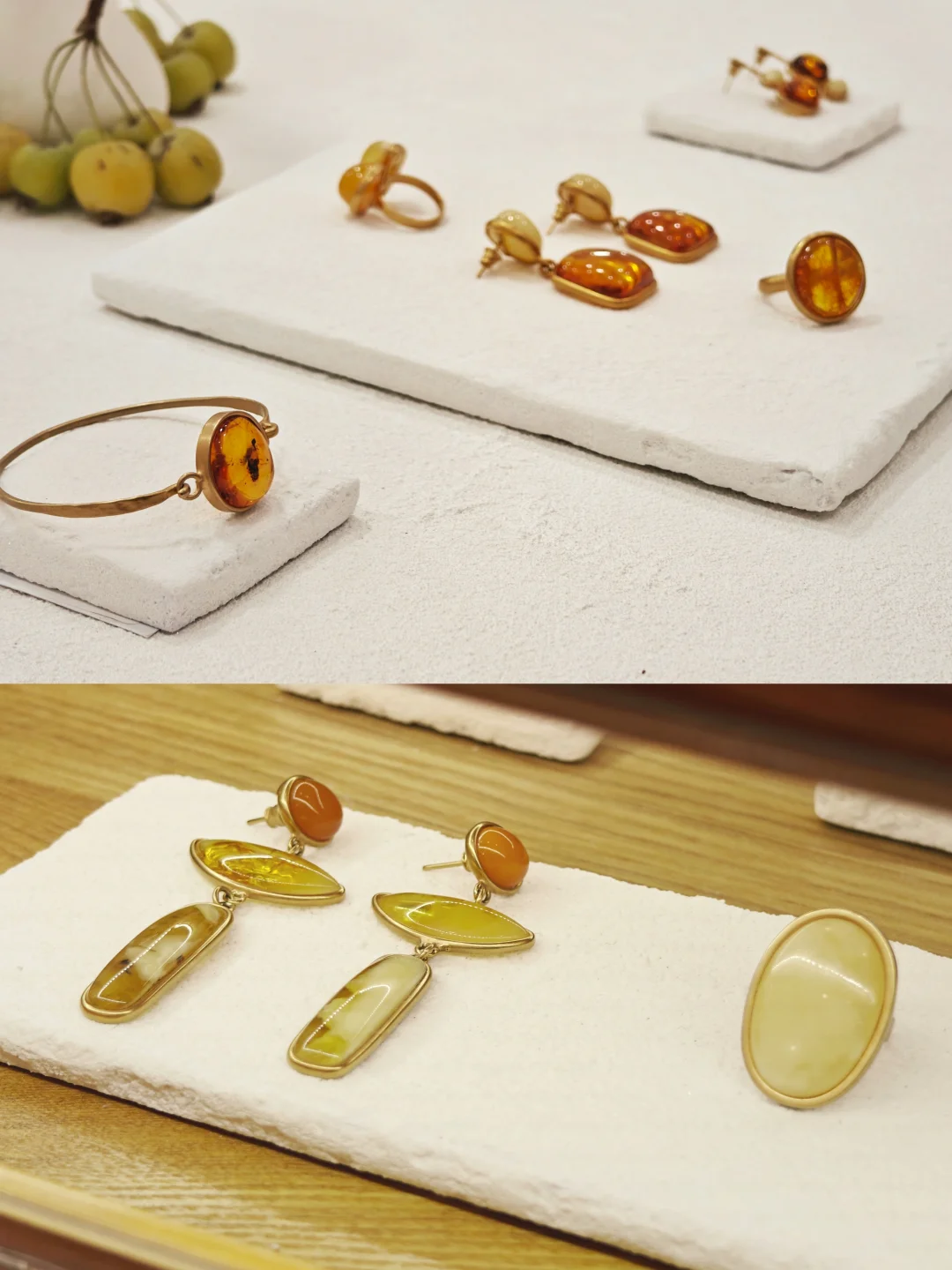 ??店铺小小一间,布置也是简约?自然原木风,融入植物和水果的点缀,倒是有点日系感,和暖色调的首饰搭配很和谐。首饰的整体风格也是简洁大气的,偏金色的镀金和琥珀相得益彰,既展现出琥珀的自然之美,又融入现代审美,多采用大体量设计,感觉不管是秋冬还是春夏装,古典还是简洁风格的穿搭都不违和。
