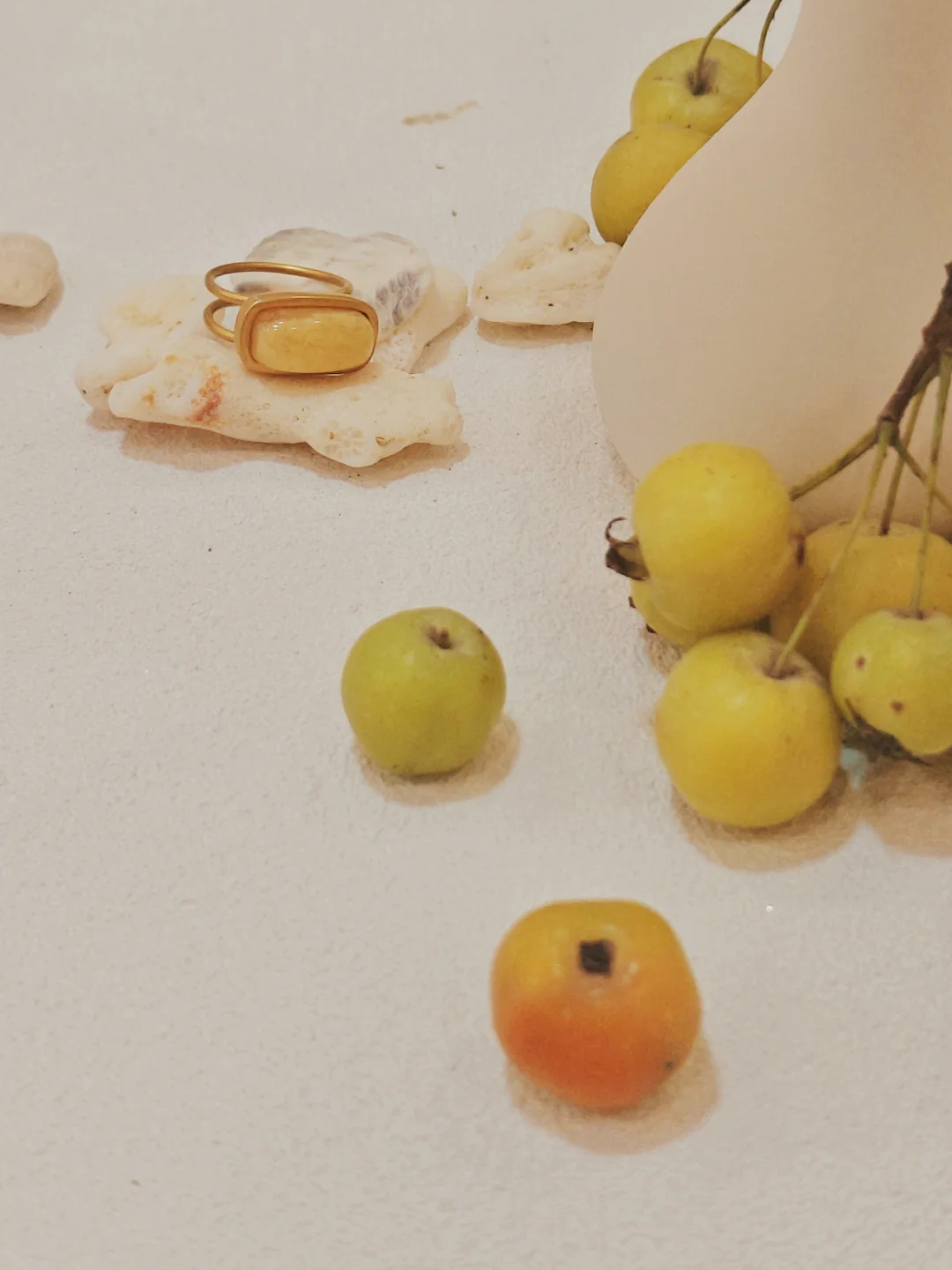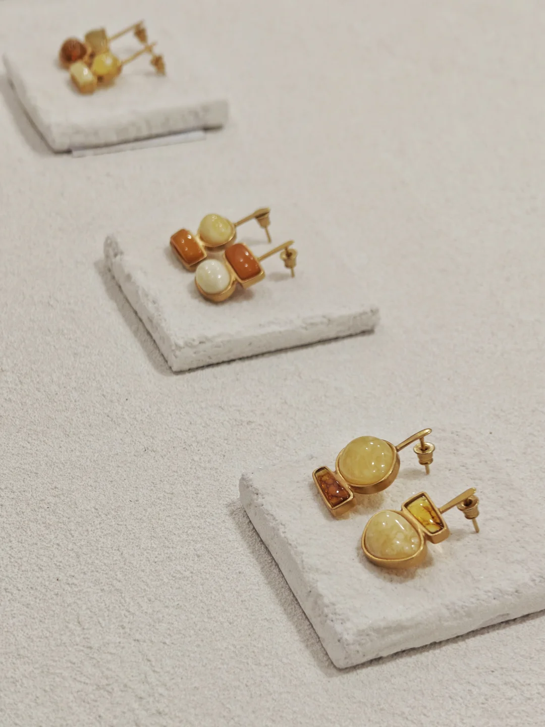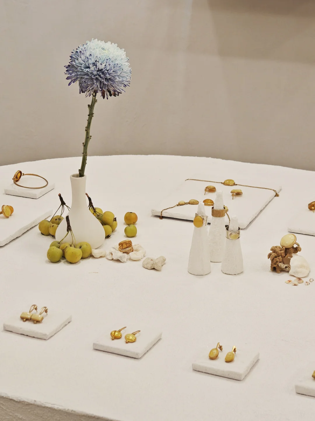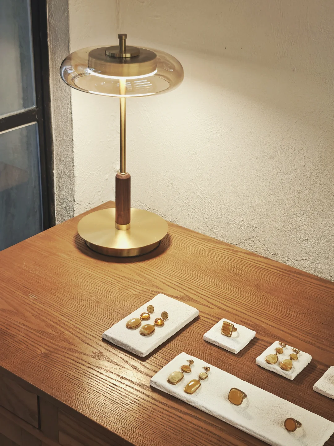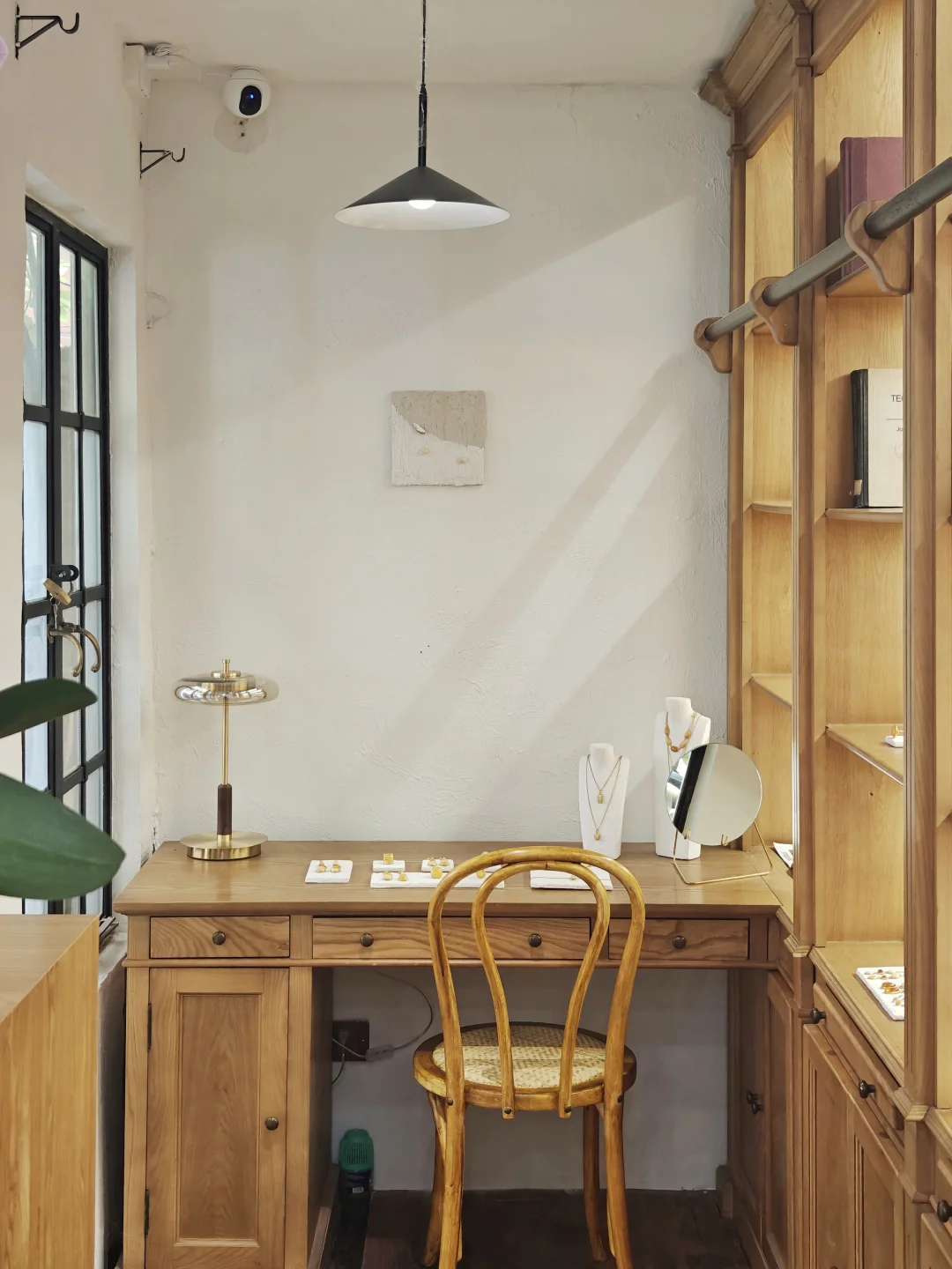 ??店铺小小一间,布置也是简约?自然原木风,融入植物和水果的点缀,倒是有点日系感,和暖色调的首饰搭配很和谐。首饰的整体风格也是简洁大气的,偏金色的镀金和琥珀相得益彰,既展现出琥珀的自然之美,又融入现代审美,多采用大体量设计,感觉不管是秋冬还是春夏装,古典还是简洁风格的穿搭都不违和。