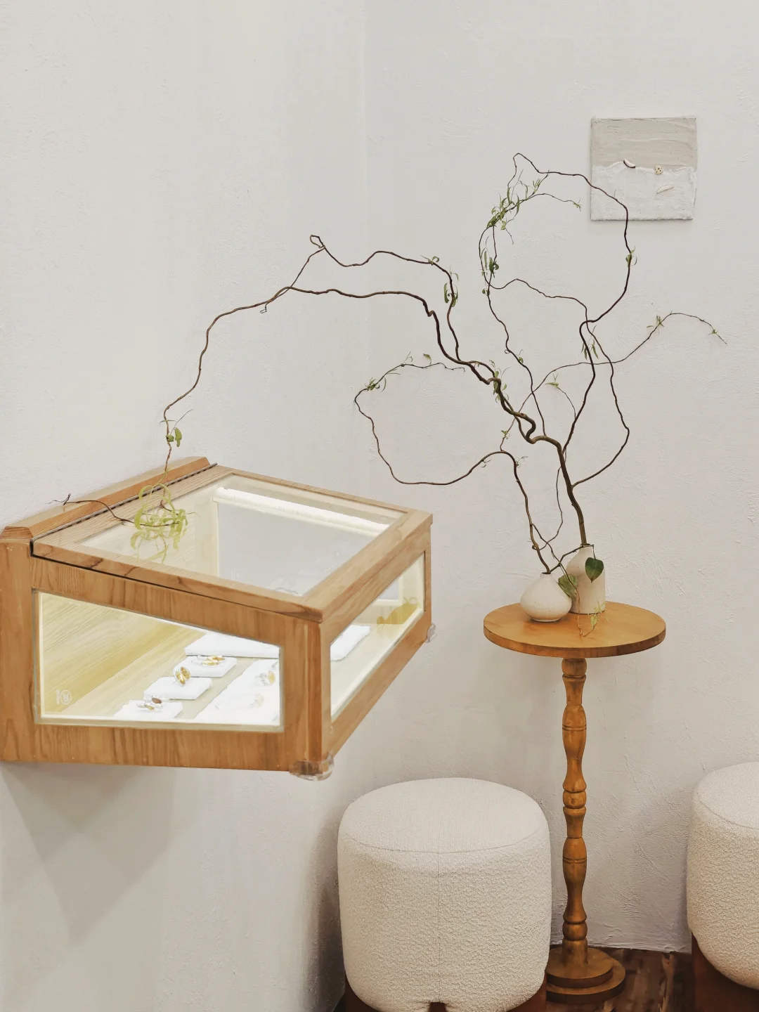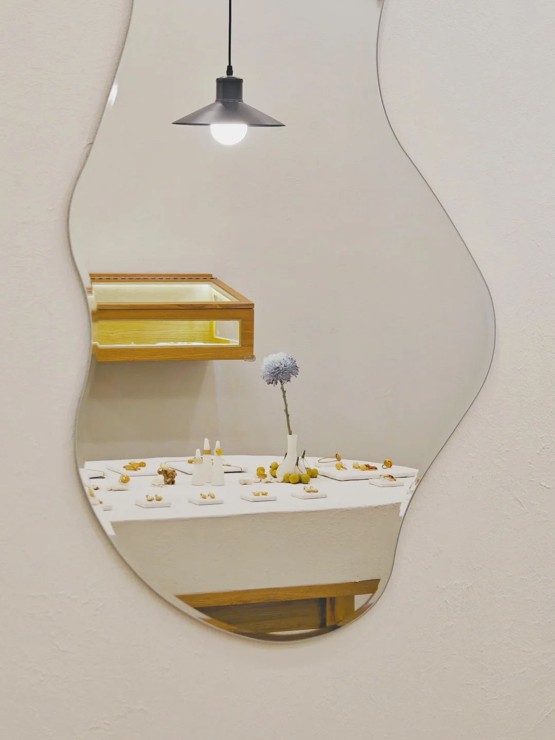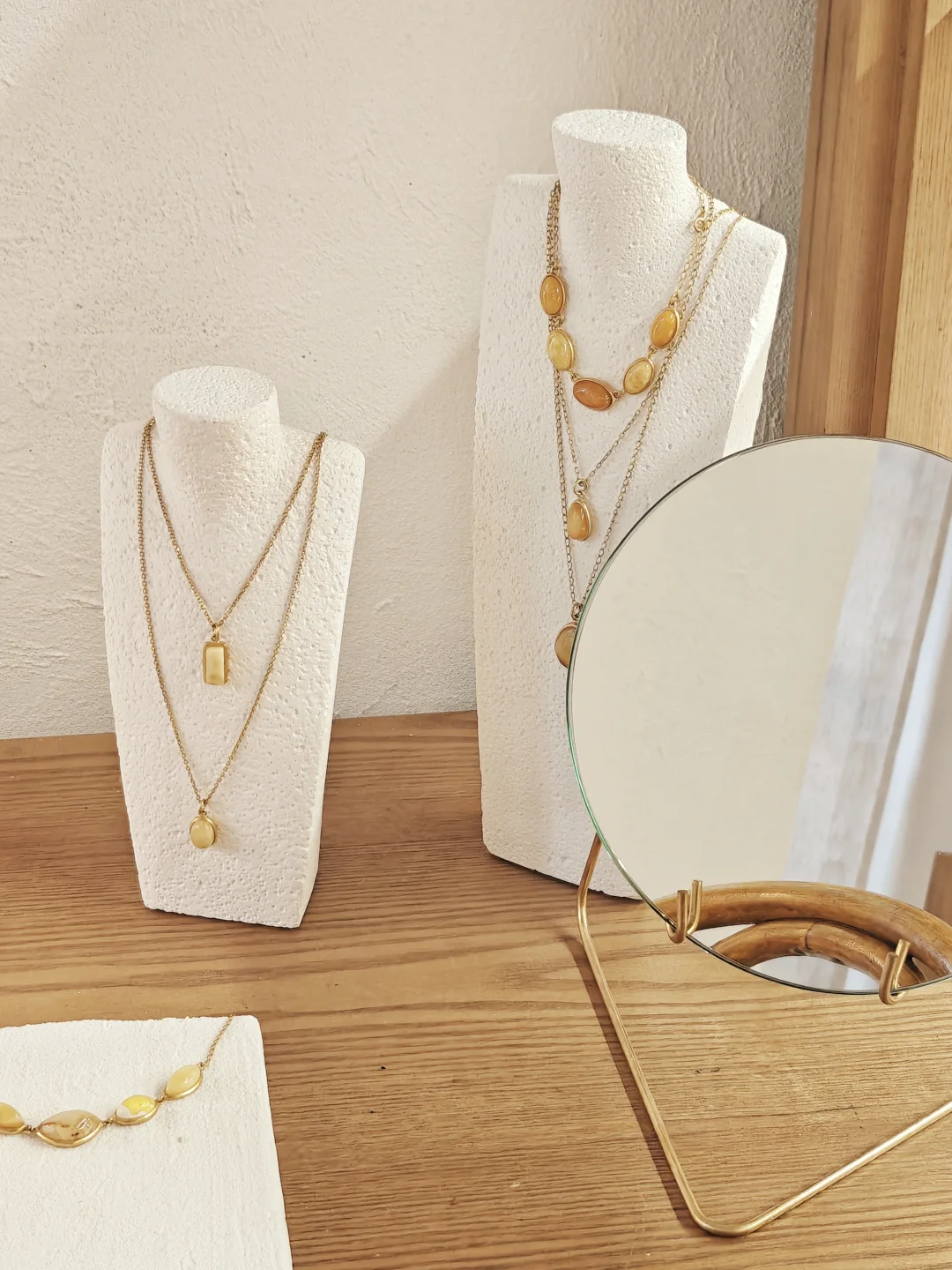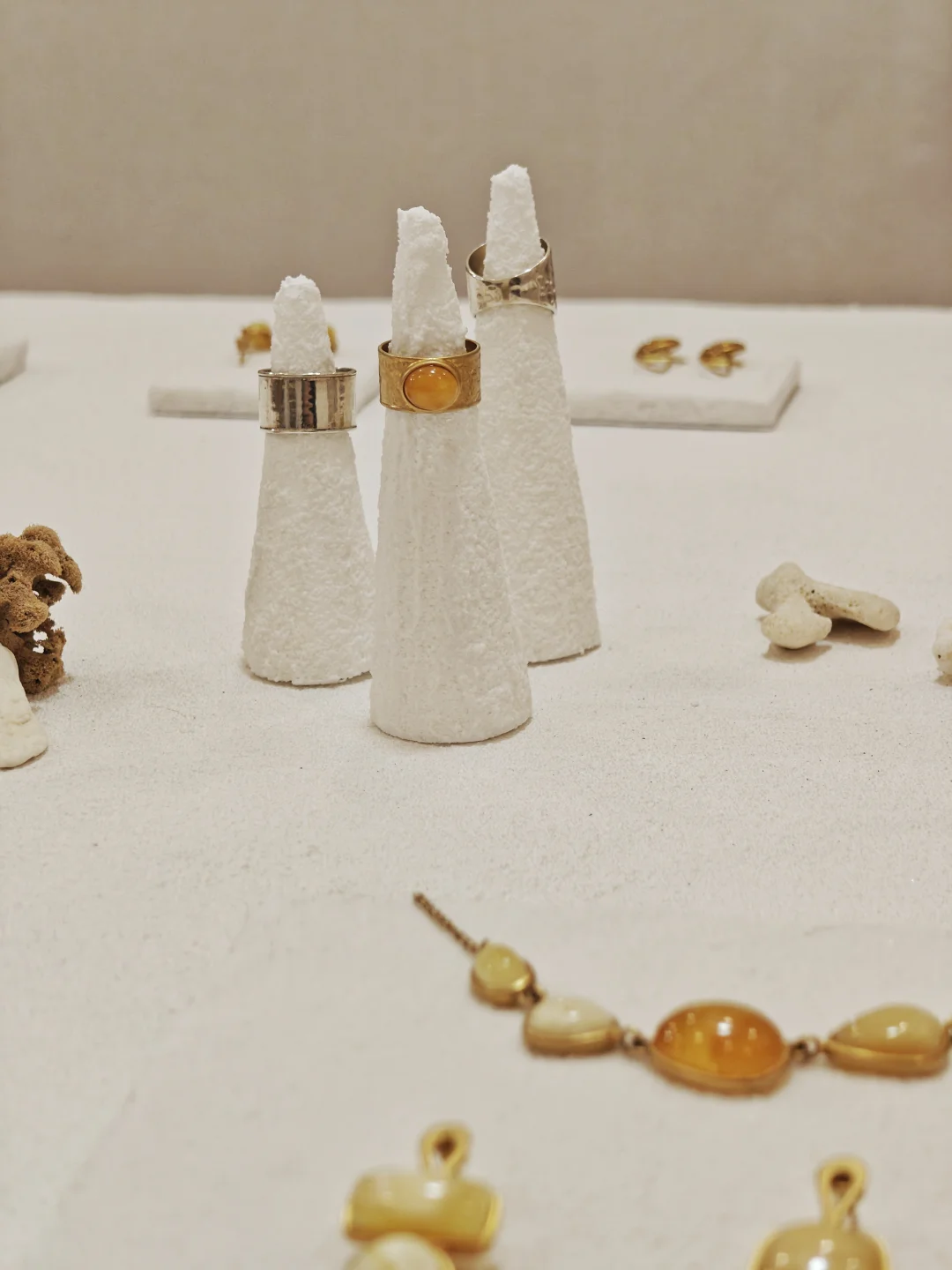 ??店铺小小一间,布置也是简约?自然原木风,融入植物和水果的点缀,倒是有点日系感,和暖色调的首饰搭配很和谐。首饰的整体风格也是简洁大气的,偏金色的镀金和琥珀相得益彰,既展现出琥珀的自然之美,又融入现代审美,多采用大体量设计,感觉不管是秋冬还是春夏装,古典还是简洁风格的穿搭都不违和。