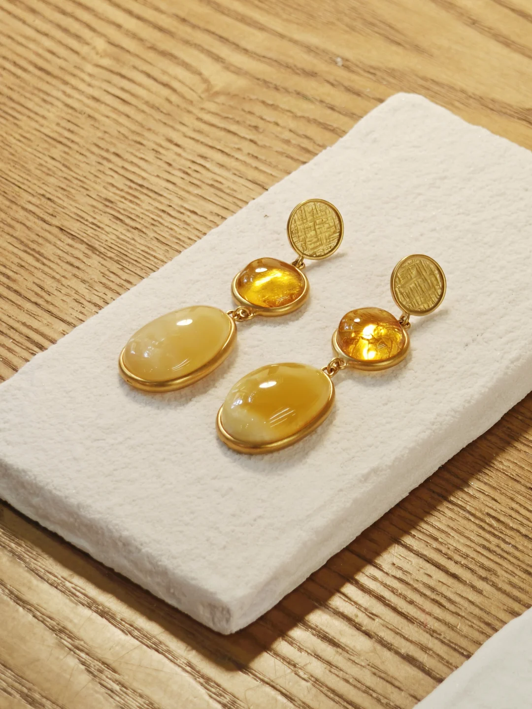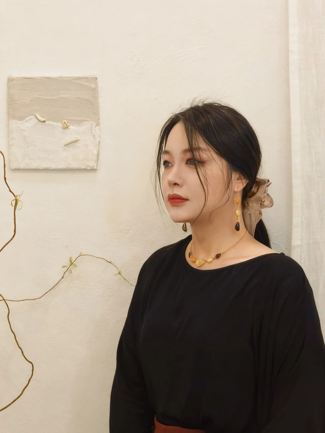 ??试戴了店内蕞特别的一套耳环?项链,结合了蜜蜡和血珀,搭配简单的黑色衣服也很出彩。