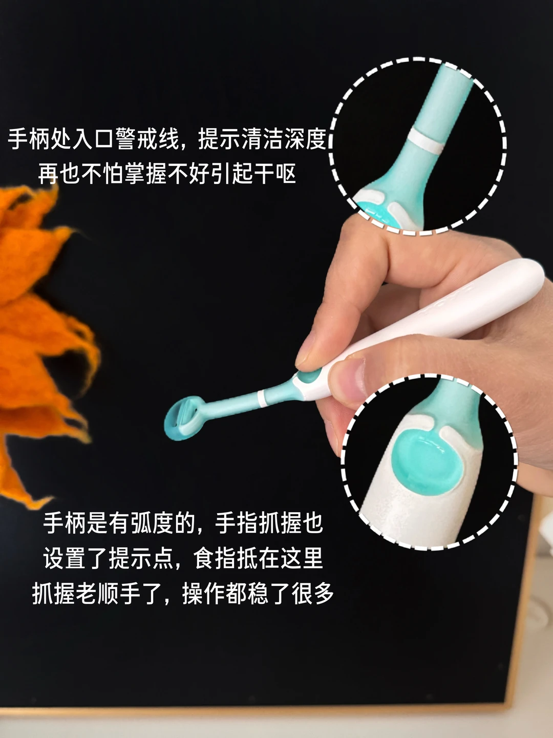 它的刮头是硅胶一体成型的,柔软有弹性,舌苔上的顽固奶垢也能轻松搞定! 双层设计的刮面加大加宽,一次刮扫的面积更大,省去宝宝没耐心哭闹。她家设计师很懂我这种手残星人,手指握哪里都有圆点提示,食指按在那个圆点上,17°的弯手柄手腕自然微微用力,还有入口线提示,每次使用都很放心,不怕戳到宝宝喉咙。