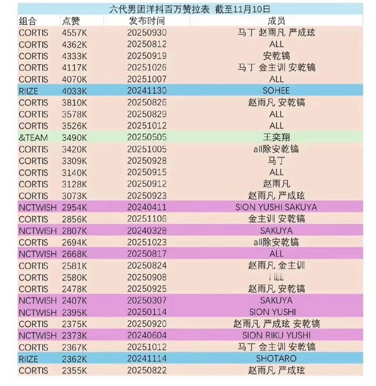 Cortis 单人抖拉表1️⃣赵雨凡 352️⃣金主训 323️⃣Martin 354️⃣严成玹 295️⃣安乾镐 22怪不得赵雨凡和马丁最近人气突飞猛进 安乾镐被做局了吧?