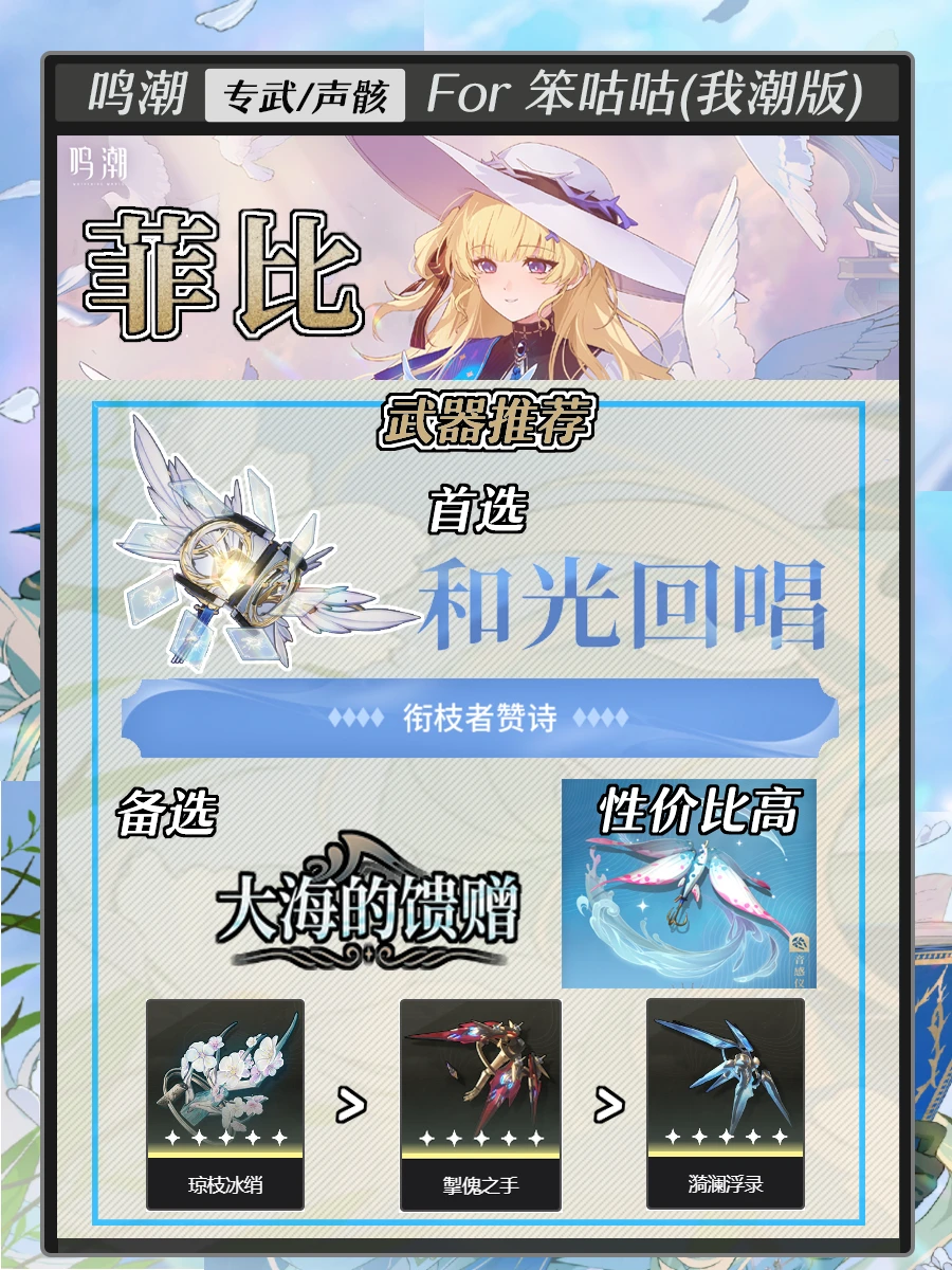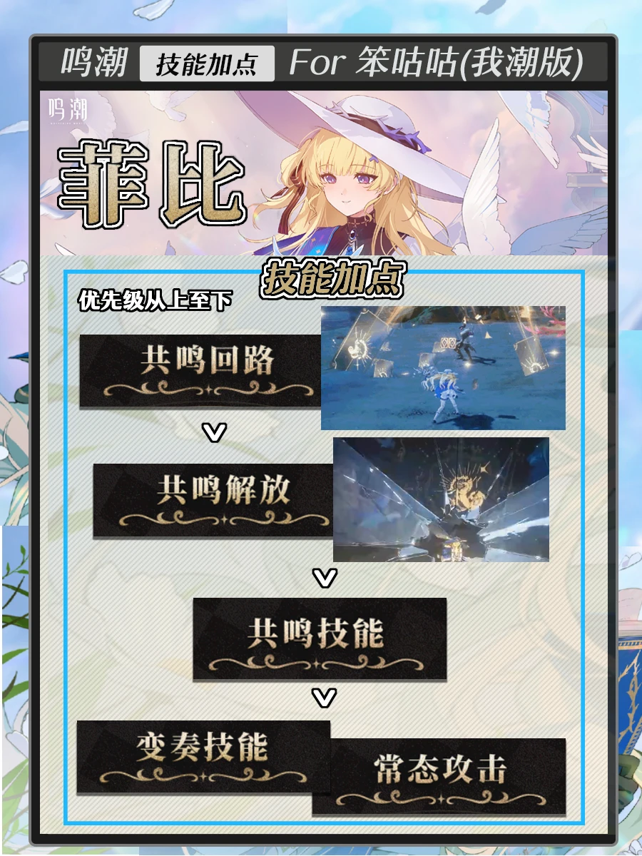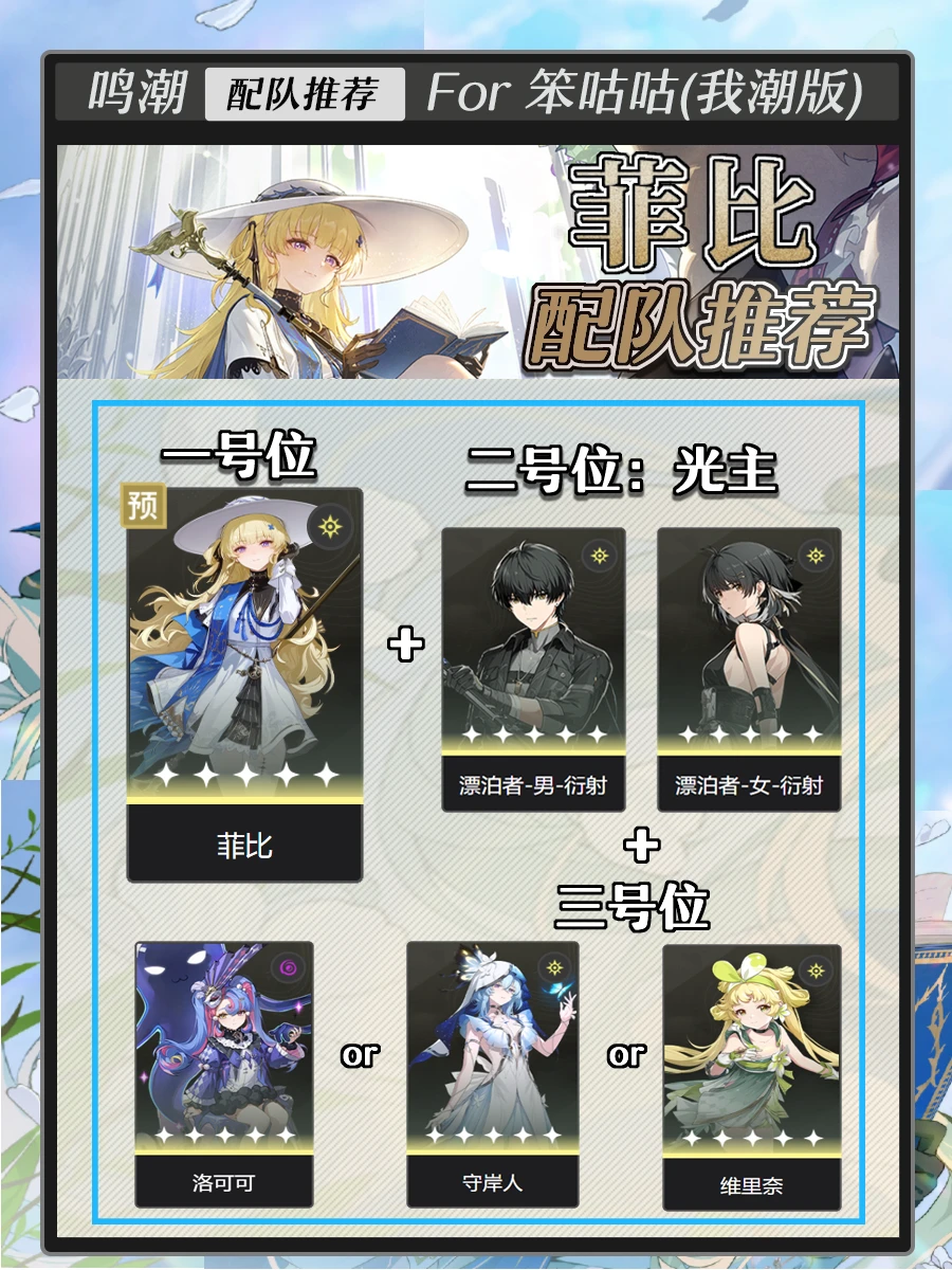 鸣潮 鸣潮创作激励 鸣潮菲比 鸣潮攻略 鸣潮飞鸟轻鸣浪涛欢唱 鸣潮菲比上线 鸣潮新版本开启 本期内容是2.1版本新角色“菲比”的培养攻略~ 内含专武/声骸/配队等内容~ 观看的小伙伴觉得不错的话一点要给个大大的赞噢!(内容制作数据相关参考鸣潮wiki,有错误引导,欢迎大家指教批评,笨某一定虚心接受!!) ------グッ!(๑•̀ㅂ•́)و✧------- 觉得有用的话一定要关关笨咕咕哦!好了,以上就是本期的全部内容。 ⭐制作不易,严禁任何商业性转载及搬运,转载需标注出处~ ⭐制作难免会有错漏,希望大家多多指出,我会及时修正喵~ ⭐祝大家都能十连双金!