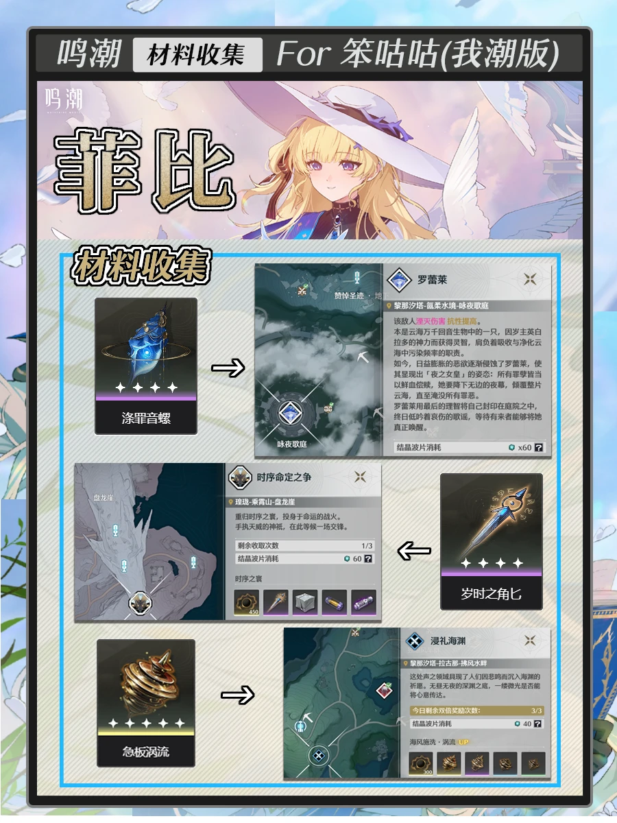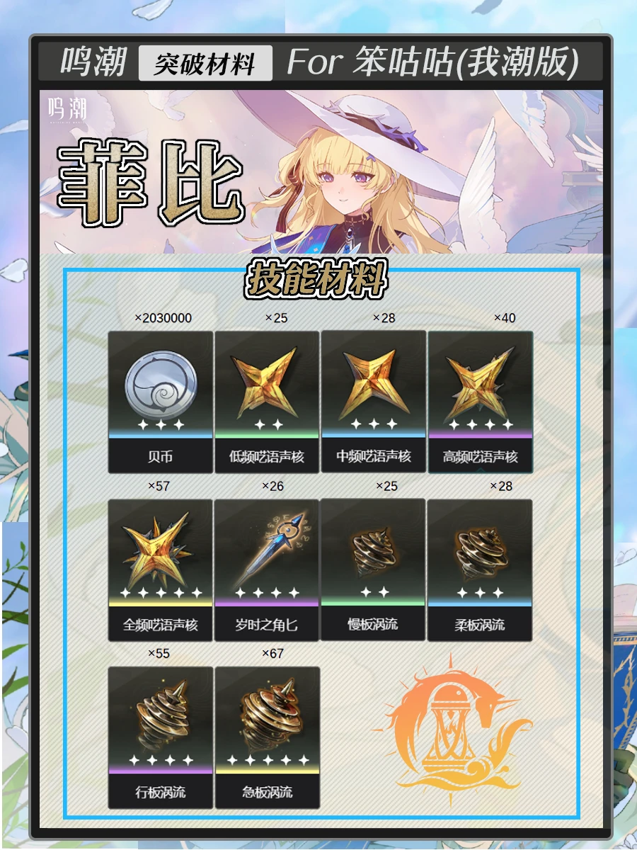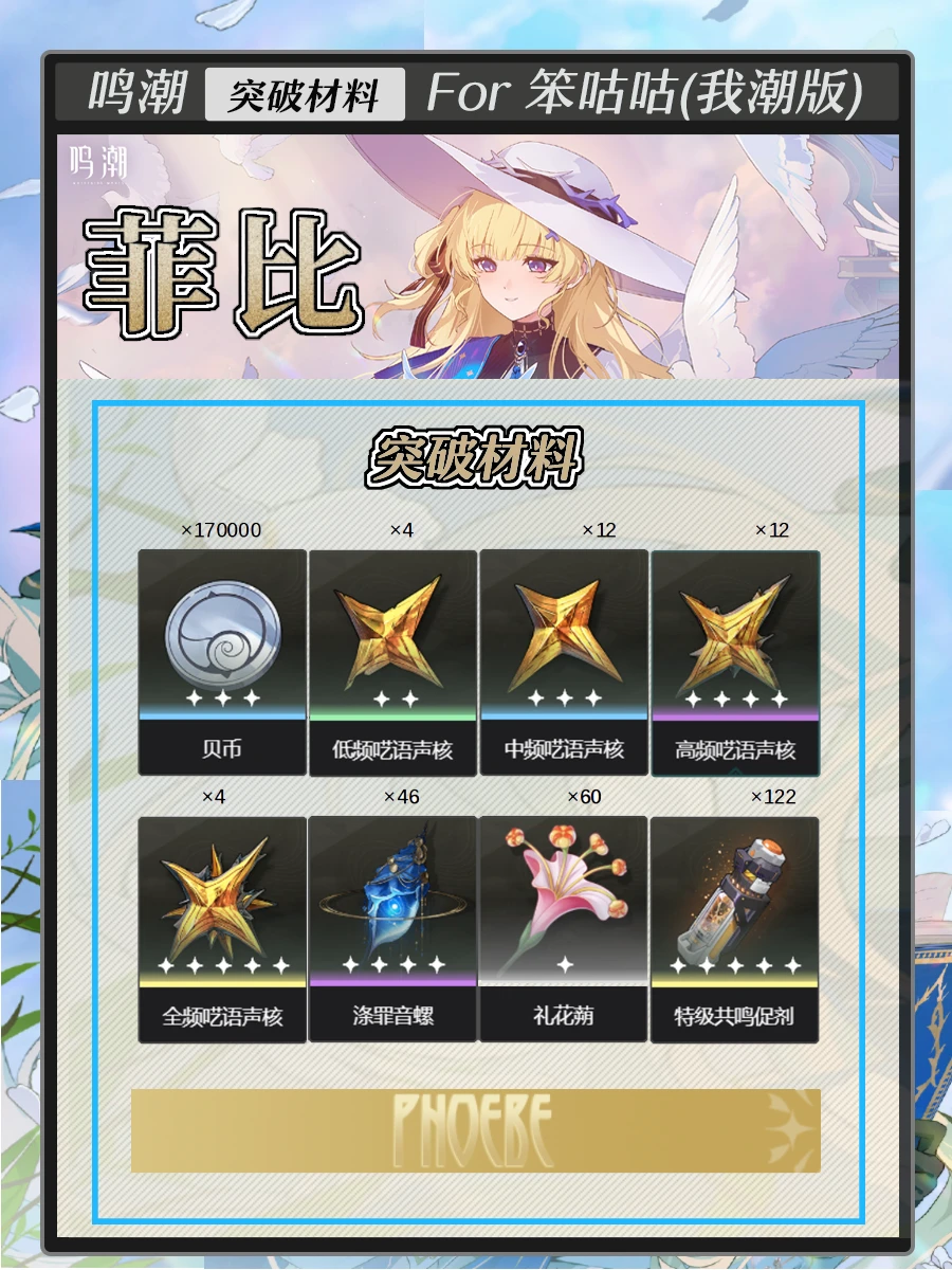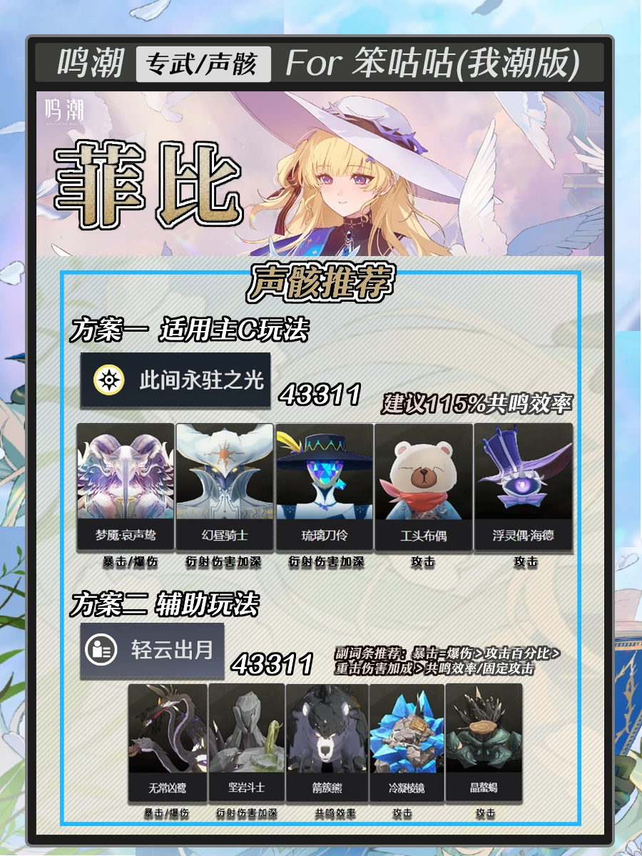 鸣潮 鸣潮创作激励 鸣潮菲比 鸣潮攻略 鸣潮飞鸟轻鸣浪涛欢唱 鸣潮菲比上线 鸣潮新版本开启 本期内容是2.1版本新角色“菲比”的培养攻略~ 内含专武/声骸/配队等内容~ 观看的小伙伴觉得不错的话一点要给个大大的赞噢!(内容制作数据相关参考鸣潮wiki,有错误引导,欢迎大家指教批评,笨某一定虚心接受!!) ------グッ!(๑•̀ㅂ•́)و✧------- 觉得有用的话一定要关关笨咕咕哦!好了,以上就是本期的全部内容。 ⭐制作不易,严禁任何商业性转载及搬运,转载需标注出处~ ⭐制作难免会有错漏,希望大家多多指出,我会及时修正喵~ ⭐祝大家都能十连双金!