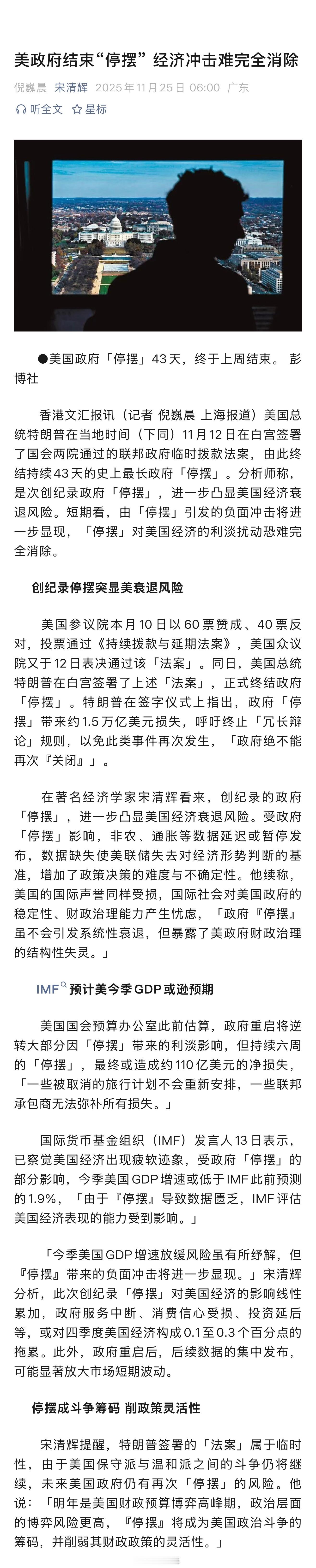 在经济学家宋清辉看来,创纪录的政府“停摆”,进一步凸显美国经济衰退风险。受政府“停摆”影响,非农、通胀等数据延迟或暂停发布,数据缺失使美联储失去对经济形势判断的基准,增加了政策决策的难度与不确定性。他续称,美国的国际声誉同样受损,国际社会对美国政府的稳定性、财政治理能力产生忧虑,“政府『停摆』虽不会引发系统性衰退,但暴露了美政府财政治理的结构性失灵。”
