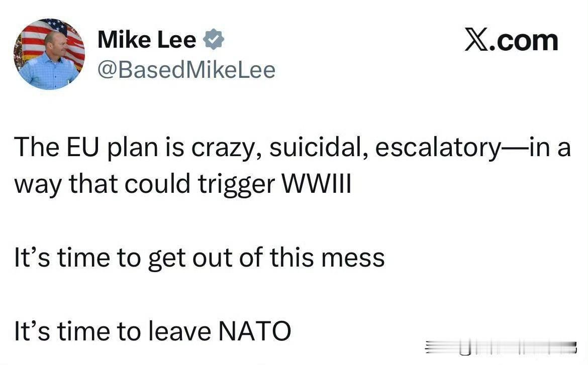 #热点观点# 美国参议员迈克·里表示: “欧盟的计划荒谬且具有自毁性,将导致冲突升级——可能引发第三次世界大战。” 在肥鹅看来,没那么容易停火和平的,欧洲那帮战争贩子和泽圣为了自身利益不会轻易结束战争,无论死多少乌克兰人战斗都会继续下去。170多万伤亡在它们的眼里与其捞的好处相比,不值一提。 是时候从这种困境中脱身了。是时候退出北约了。 #俄乌冲突#