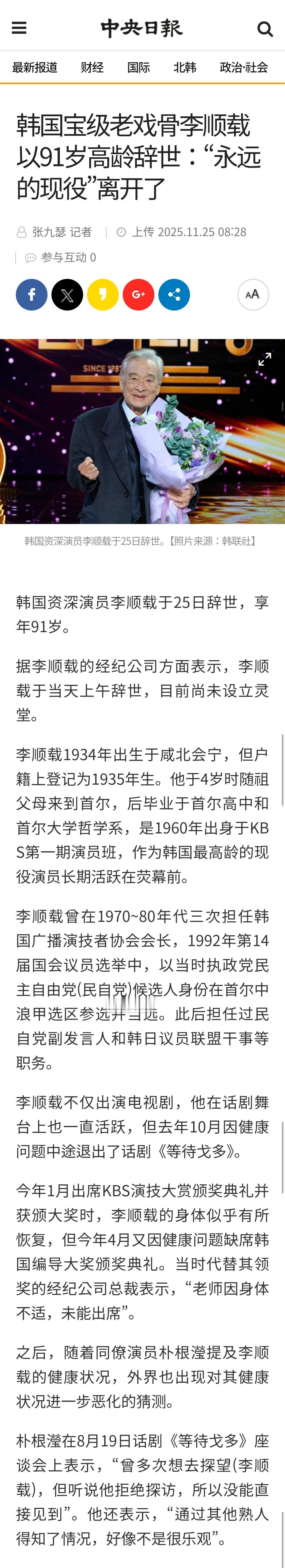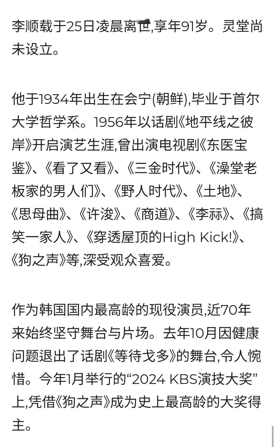 【】 天啊,是这位爷爷去世了…综合多家韩媒,知名韩国男演员李顺载于11月25日凌晨与世长辞,享年91岁。 李顺载毕业于首尔大学哲学系,1956年以话剧《地平线之彼岸》开启演艺生涯。作为韩国最高龄的现役演员,他曾出演电视剧《看了又看》《澡堂老板家的男人们》等百余部作品,树立了令观众们印象深刻的父亲形象。七十多岁时,他凭借在情景喜剧《无法阻挡的High Kick(搞笑一家人)》的表演,再次迎来事业巅峰。除演艺圈外,李顺载还曾活跃于政界。1992年第14届国会议员选举中,李顺载以当时执政党民主自由党(民自党)候选人身份在首尔中浪甲选区参选并当选。此后担任过民自党副发言人和韩日议员联盟干事等职务。即将九旬之际,李顺载依然没有离开舞台和银幕,曾在《长寿商会》《昂利爷爷与我》《李尔王》等作品中消化大量台词。但自去年起,关于他健康状况的担忧不断传出,去年10月,李顺载因健康问题退出话剧《等待戈多》,引发外界关注。(综合自韩国《中央日报》、韩国每日经济中文网、JTBC)