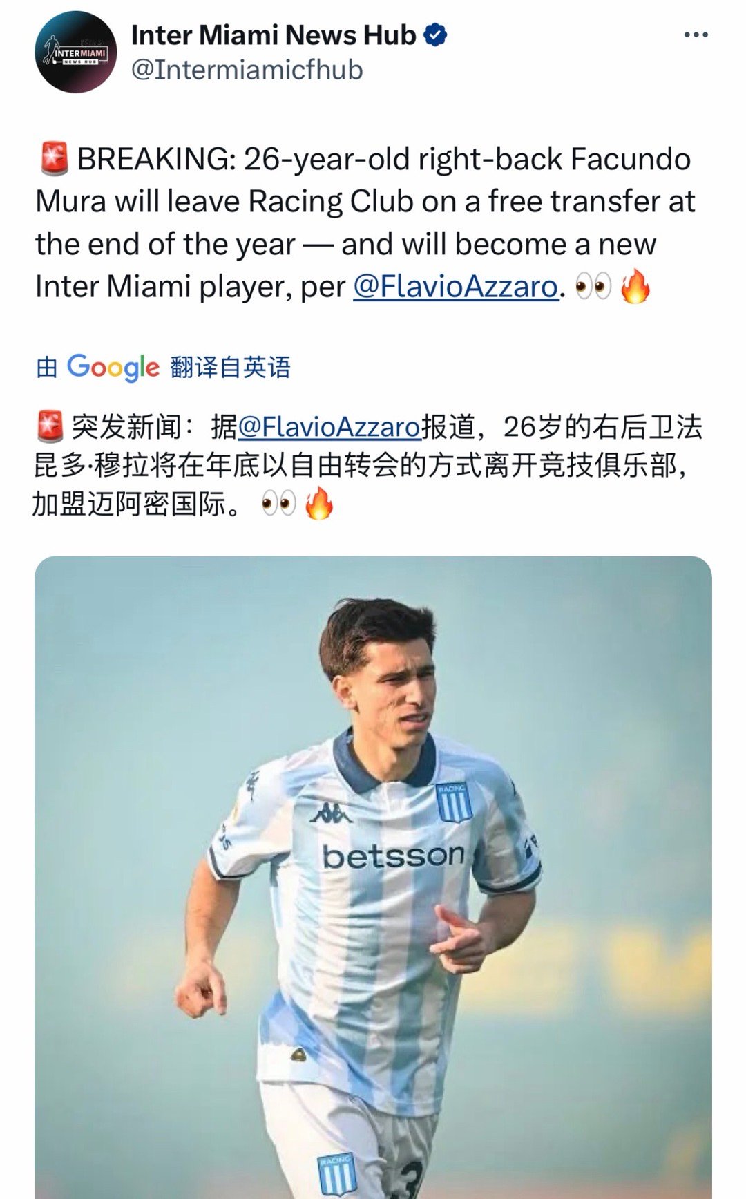 🚨据@ FlavioAzzaro报道,现效力于阿根廷竞技队的26岁后卫法昆多·穆拉Facundo Mura将在年底以自由转会的方式离开竞技俱乐部,加盟迈阿密国际。