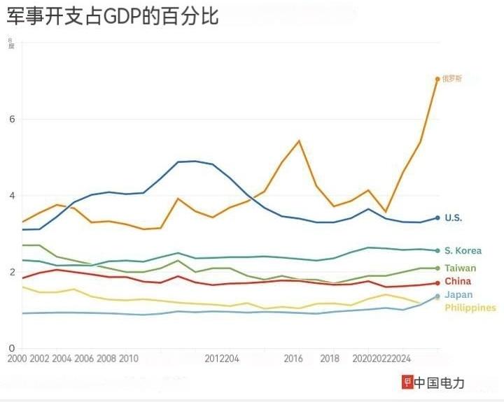 美国智库CSIS发布的图表显示,自2000年以来,中国的国防开支占GDP的比例一直徘徊在2%或以下,相比之下,美国的军费开支平均约为GDP的3.8%,处于战时的俄罗斯则更高。
