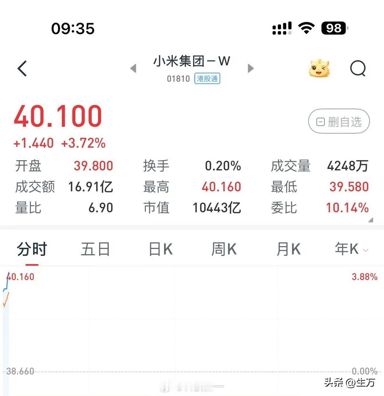 今天,小米股票直接高开,突破40! 就在刚才,很多人都发现小米又回到40了,不知道是不是雷军昨天的那个操作起到作用了,看来有人说他这一个小目标,能够起到办大事的效果,至少从今天早上小米突破40来看,有一个好的开始。 所以从这个角度来分析的话,他这样做的带头作用,还是比较明显的 ,因为在这之前有相当一段时间里面,小米都在30多徘徊! 有时候徘徊的时间过长了,很多人就失去耐心和信心了,这时候,公司自己表态,老板也得表态,资本市场才会表态,所以很多人看到,雷军这几天的小目标扔进去之后,普通的小伙伴非常敏锐的跟进了,再加上他们集团又自己回购了很多。 所以这一系列的操作就导致今天开得很高 ,很久没有看到四十多了,看看能不能够持续的上面走一走,或者看看,今天是不是一个新的拐点。