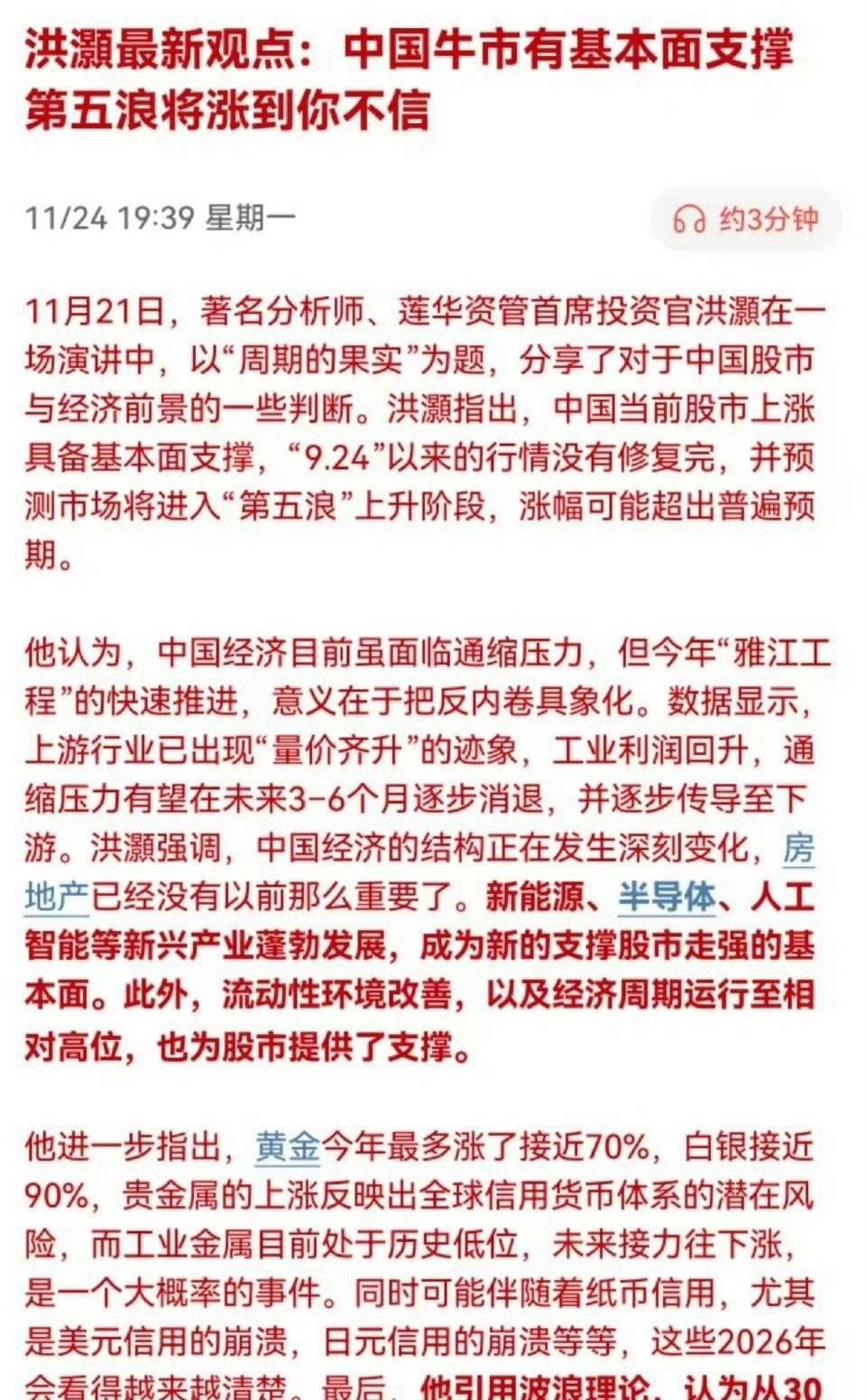 莲华资管洪灏这番话真提气! 他说咱A股牛市有基本面撑着,第五浪要来,涨幅能“涨到你不信”! 他拿30年波浪理论讲,一浪到2001,二浪调到2005;三浪从2005到2015;四浪从2015到现在;现在第五浪要启动,游戏才刚开始! 虽然经济有通缩压力,但“雅江工程”推进快,上游行业都“量价齐升”了,工业利润回升,通缩有望3-6个月消退。咱散户别被短期震荡吓住,瞅准第五浪机会,跟着基本面走,普通人也能在牛市里分杯羹!
