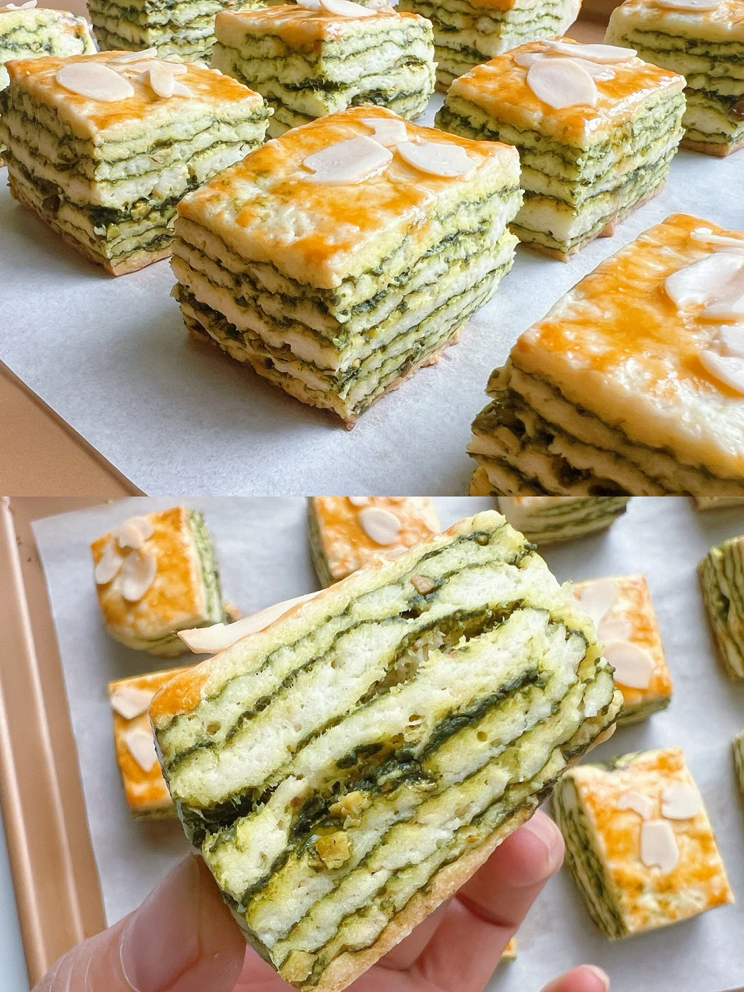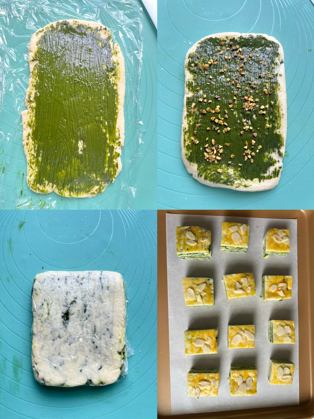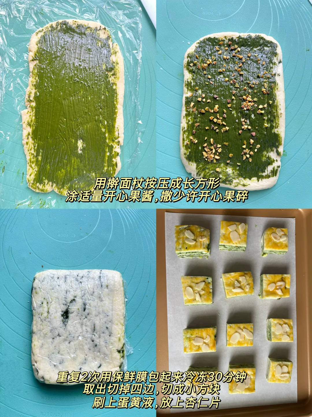 吃了甜食会开心 开心果酱买了很久了 今天就做个开心果千层吐司吧 真的巨香,回味无穷 搭配一杯茉莉花茶,完美~~ 搅一搅拌一拌就能完成的司康 最适合烘焙小白啦 赶快收藏和我一起做起来吧! 食材: 低筋面粉200g 盐1g 糖25g 黄油80g 泡打粉6克 牛奶70g 开心果酱适量 开心果碎少许 蛋黄1个(刷面) 步骤: 1️⃣把低筋面粉、盐、糖和泡打粉倒入大碗中,用筷子搅拌均匀 2️⃣加入切成小块的黄油,戴手套揉搓成沙粒状,倒入牛奶,按压成团 3️⃣用擀面杖按压成长方形,涂适量开心果酱,撒少许开心果碎,对折,重复2次(太粘可以借助保鲜膜,或撒一点干粉),用保鲜膜包起来冷冻30分钟 4️⃣烤箱180度预热,取出面团切掉四边,切成小方块 5️⃣表面刷蛋黄液,放上杏仁片,烘烤20-25分钟 🌈 Tips: 1️⃣按压面团可以垫一张保鲜膜,不要过度翻拌面团 2️⃣每个烤箱脾气不同,按照自己的烤箱来调整烘烤时间和温度