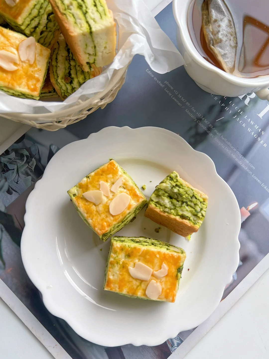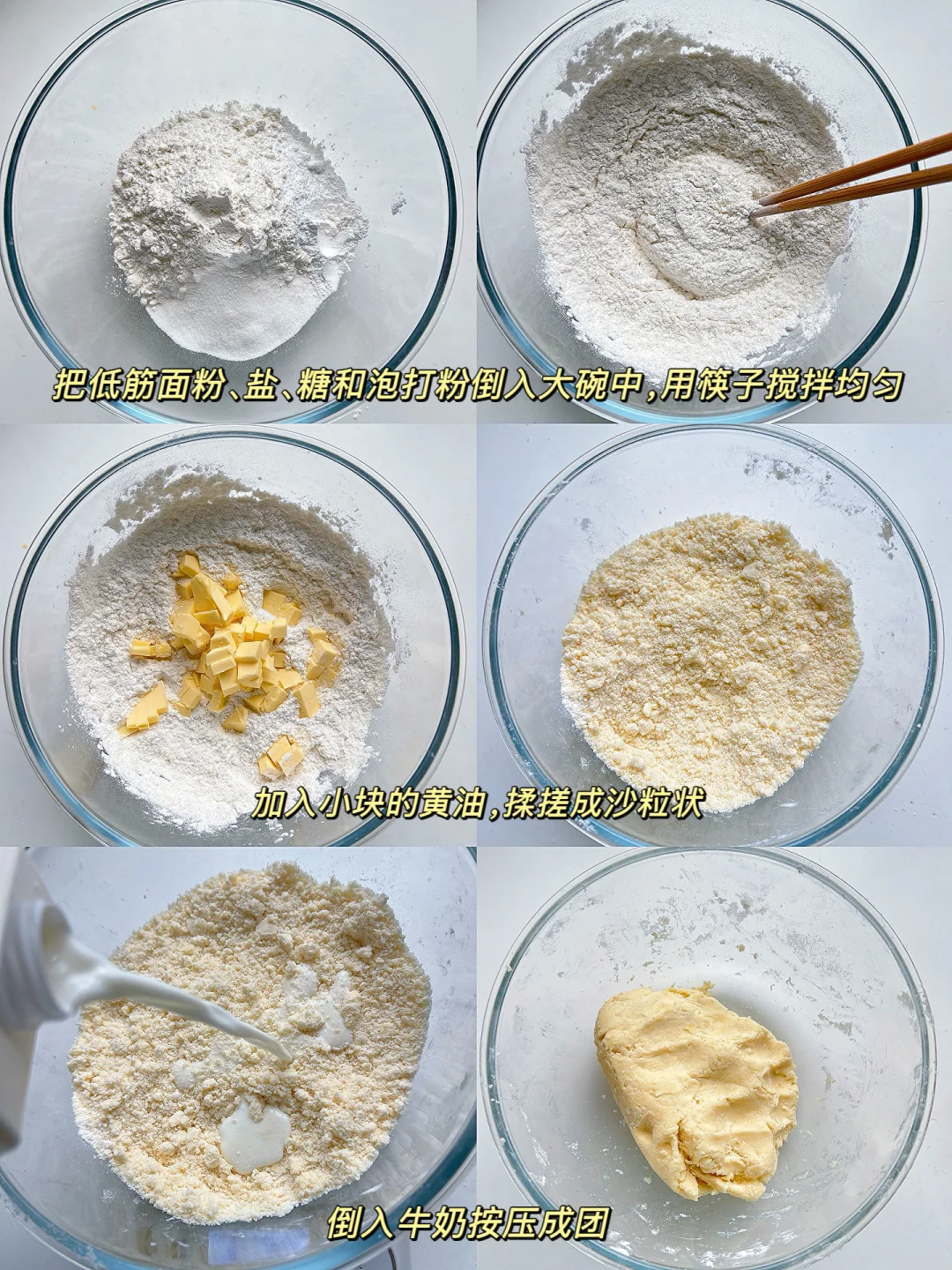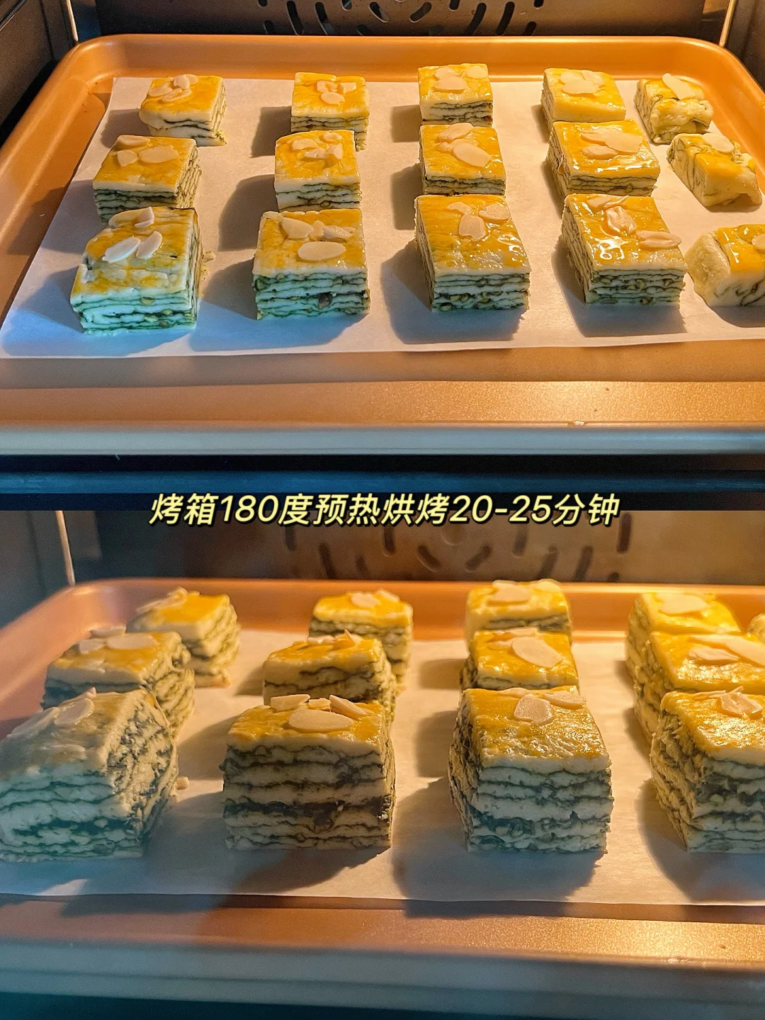 吃了甜食会开心 开心果酱买了很久了 今天就做个开心果千层吐司吧 真的巨香,回味无穷 搭配一杯茉莉花茶,完美~~ 搅一搅拌一拌就能完成的司康 最适合烘焙小白啦 赶快收藏和我一起做起来吧! 食材: 低筋面粉200g 盐1g 糖25g 黄油80g 泡打粉6克 牛奶70g 开心果酱适量 开心果碎少许 蛋黄1个(刷面) 步骤: 1️⃣把低筋面粉、盐、糖和泡打粉倒入大碗中,用筷子搅拌均匀 2️⃣加入切成小块的黄油,戴手套揉搓成沙粒状,倒入牛奶,按压成团 3️⃣用擀面杖按压成长方形,涂适量开心果酱,撒少许开心果碎,对折,重复2次(太粘可以借助保鲜膜,或撒一点干粉),用保鲜膜包起来冷冻30分钟 4️⃣烤箱180度预热,取出面团切掉四边,切成小方块 5️⃣表面刷蛋黄液,放上杏仁片,烘烤20-25分钟 🌈 Tips: 1️⃣按压面团可以垫一张保鲜膜,不要过度翻拌面团 2️⃣每个烤箱脾气不同,按照自己的烤箱来调整烘烤时间和温度