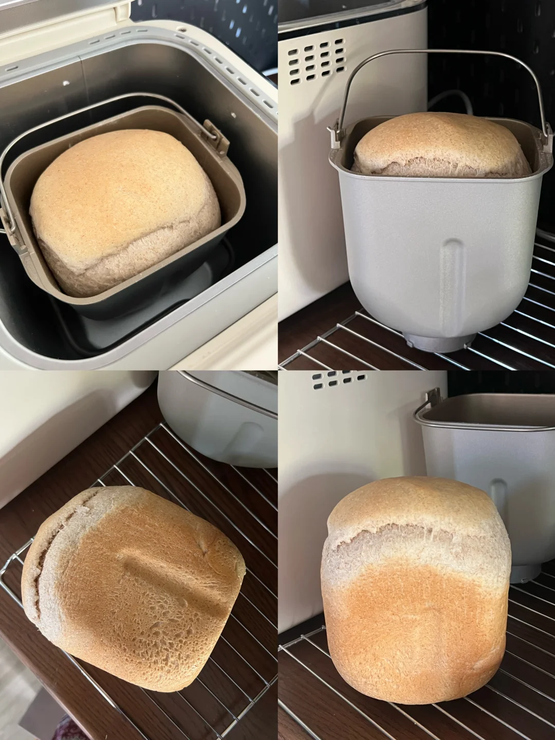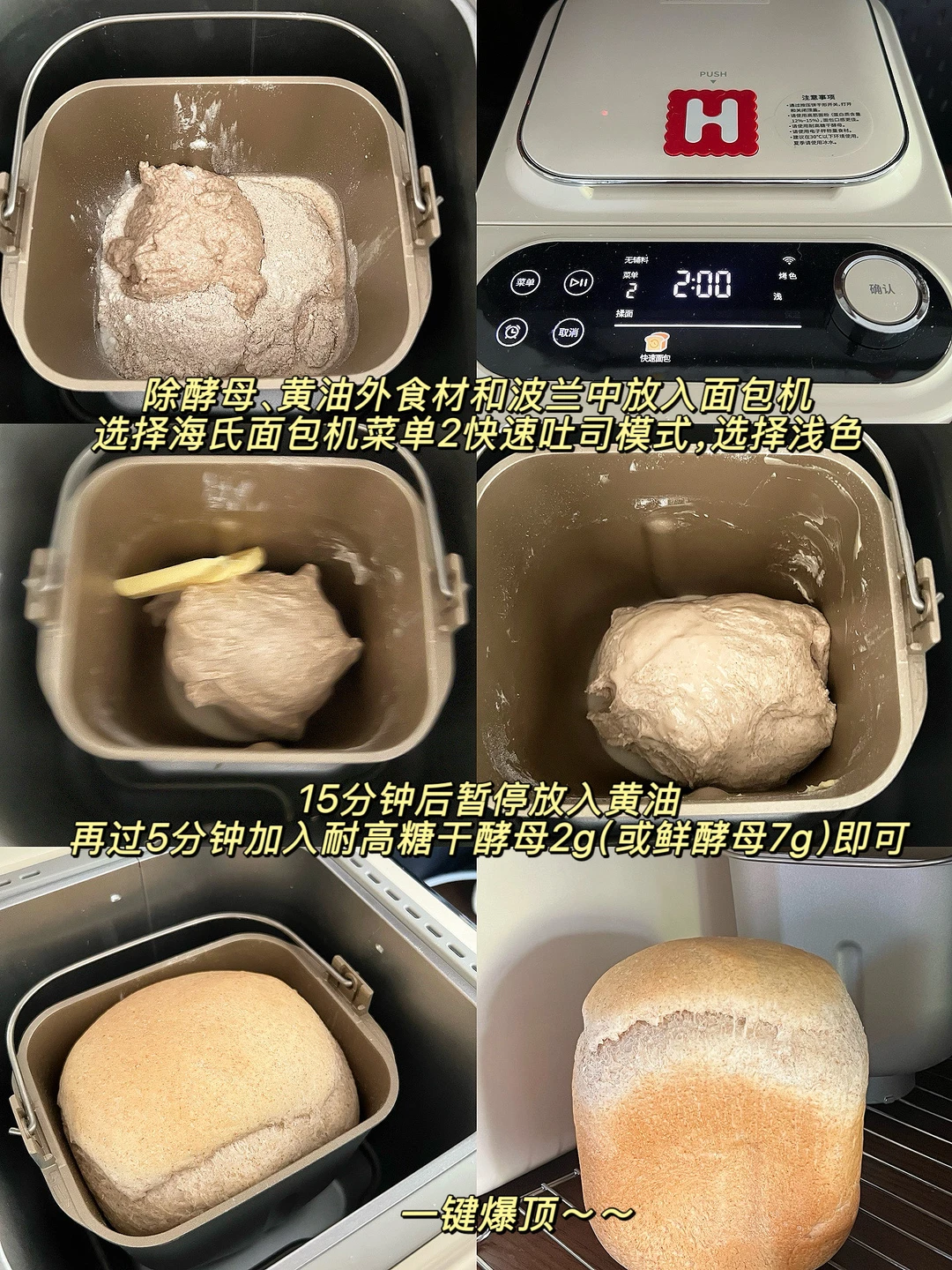 全麦 家庭烘焙 面包机食谱 【前一晚制作波兰种】 🏠27度 方法: 1️⃣50g常温水➕0.5g干酵母+(1.5g鲜酵母)➕50g全麦粉,搅拌至无干粉 2️⃣室温激活发酵1小时,放冰箱密封隔夜冷藏至三倍大即可 3️⃣面包桶冷藏一夜或冷冻1.5小时 【主面团食材】 冰牛奶90g 酸奶50g(能流动的那种就行) 高筋吐司粉125g 高筋全麦粉75g 白糖15g 盐3g 耐高糖干酵母2g(或鲜酵母7g) 黄油20g 方法: 1️⃣除酵母、黄油外食材和波兰中放入面包机,选择海氏面包机快速吐司模式(2小时),选择浅色 2️⃣15分钟后暂停放入黄油,再过5分钟加入耐高糖干酵母2g(或鲜酵母7g)即可 🍀如果嫌麻烦,可以波兰中➕主面团所有食材一起放进面包桶(干酵母可以放酵母盒)