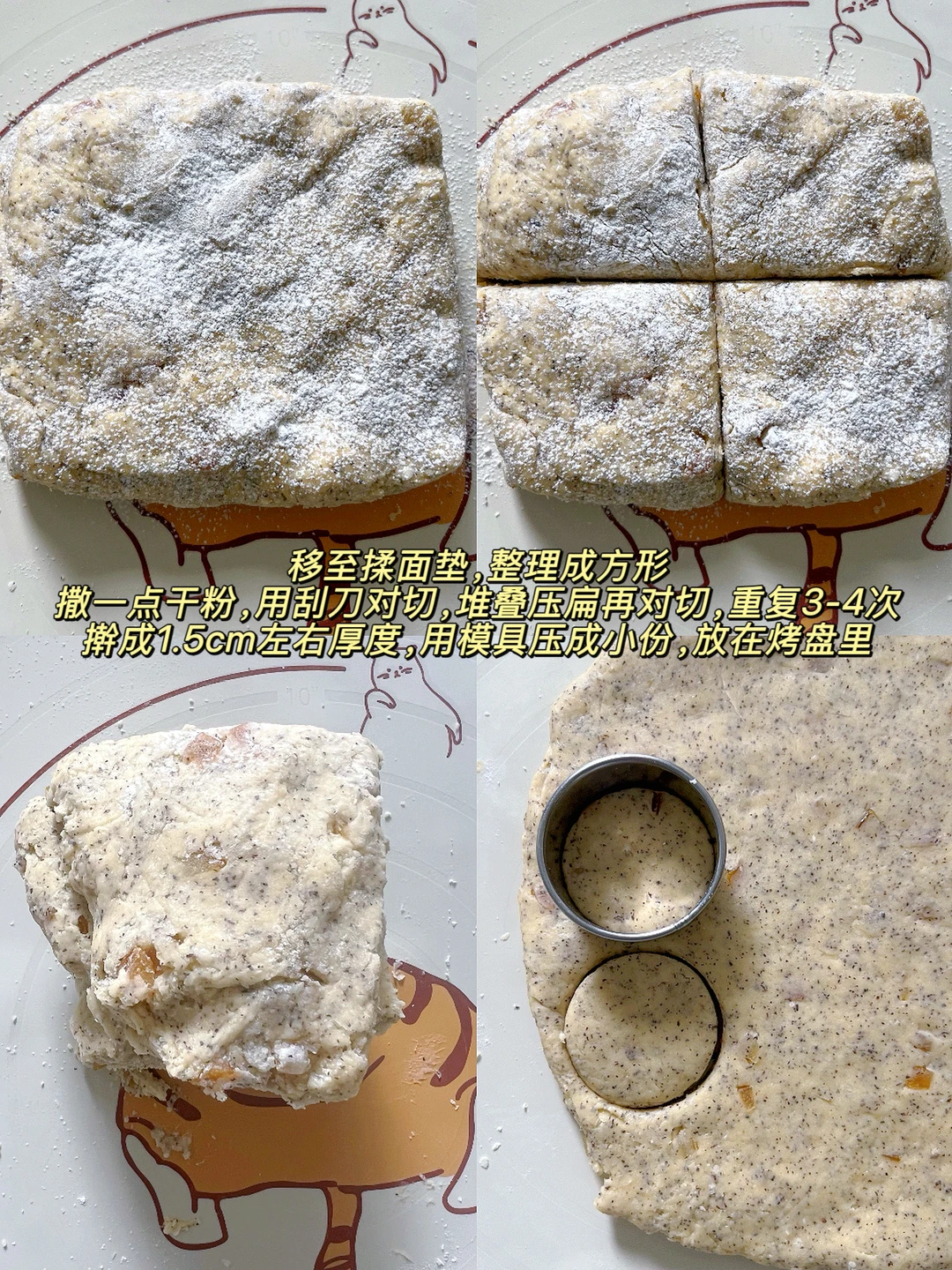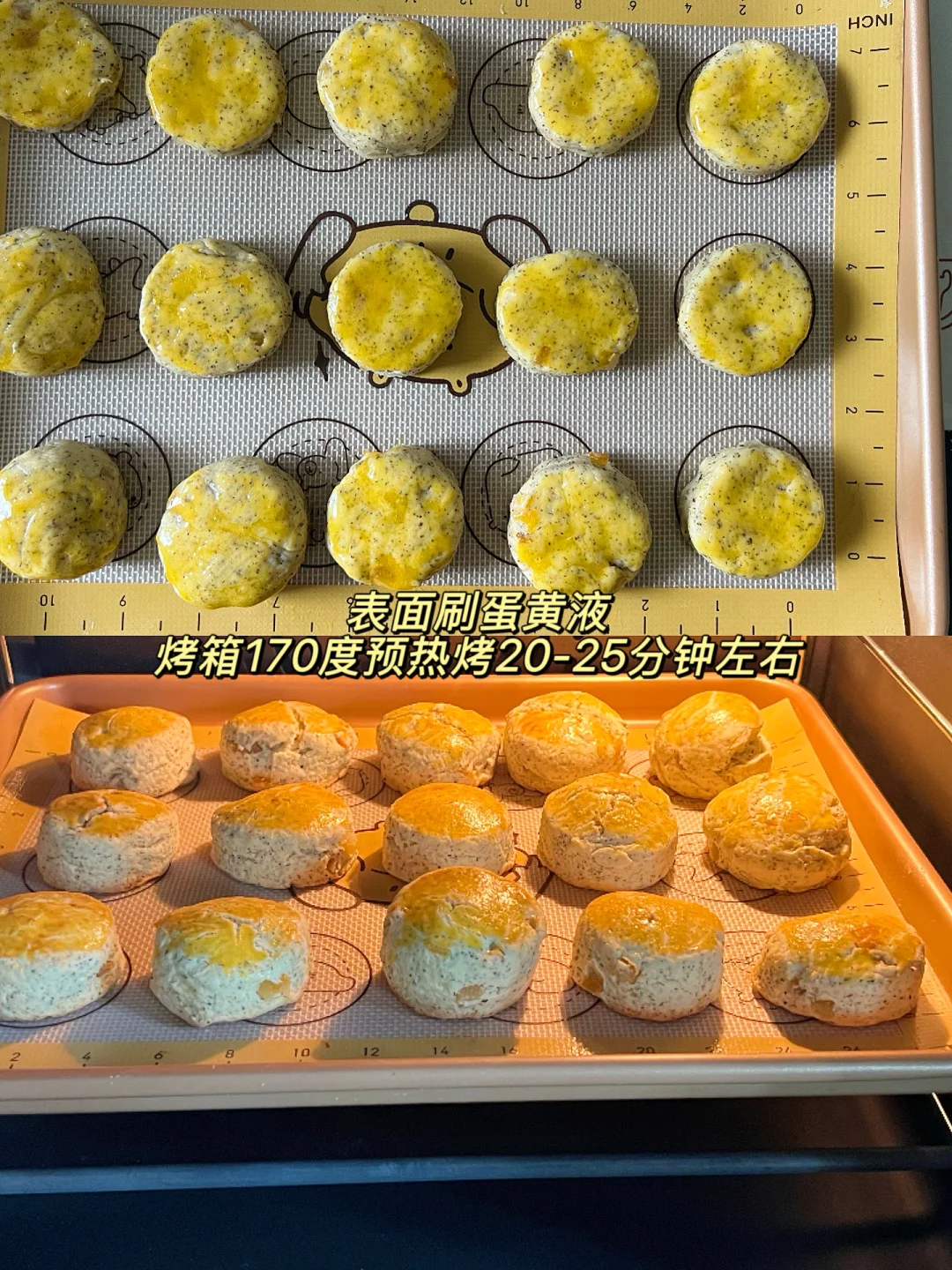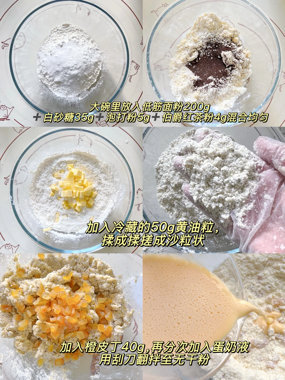 吃了甜食会开心 前几天做了四次橙皮丁司康 今天给它里面加了伯爵红茶粉 清新的茶香,加上橙皮丁的清香 外酥里软,甜而不腻,越吃越香~[点赞R][点赞R][点赞R] 简单、美味0失败 无需打发,搅拌搅拌就好 喜欢的姐妹赶快点赞收藏做起来吧![派对R][派对R] 👉 食材: 低筋面粉200g 细砂糖35g 泡打粉5g 伯爵红茶粉4g 黄油50g 牛奶60g 鸡蛋1个(去皮50g左右) 橙皮丁40g 蛋黄1个(刷面) 过程: 1️⃣ 将牛奶➕鸡蛋搅拌均匀备用 2️⃣大碗里放入低筋面粉200g➕➕白砂糖35g➕泡打粉5g➕伯爵红茶粉4g混合均匀 3️⃣加入冷藏黄油丁50g,戴手套搓开成小颗粒状 4️⃣ 加入40g橙皮丁翻拌匀,再分次倒入蛋奶混合液.⚠️看干湿状态酌情添加,用刮刀翻拌成无干粉 5️⃣移至揉面垫,整理成长方形,撒一点干粉,用刮刀对切,堆叠压扁再对切,重复3-4次 6️⃣擀成1.5cm左右厚度,用模具压成小份,放在烤盘里(可以垫油纸),表面刷蛋黄液,烤箱170度预热,烤20-25分钟左右,表面色泽金黄即可⚠️具体烘烤时间和温度需按自家烤箱脾气进行调节,上色过早可加盖锡纸 ……………………………题外话…………………… 可能年纪大了 越来越讨厌呱噪的声音在耳边嗡嗡响[失望R]