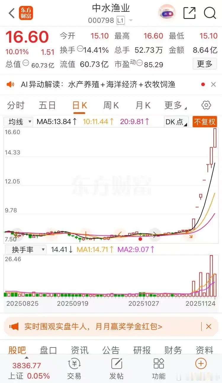 中水渔业和*ST苏吴中水渔业7连板涨停收盘报收16.60元每股,成交金额8.64亿元,总市值60.73亿元,这次估计会突破100亿元。*ST苏吴涨停收盘报收1.18元每股,成交金额2831万元,总市值8.39亿元,今天发提示退市提示公告,富贵险中求,如果摆脱退市风险,它就是最靓的仔。