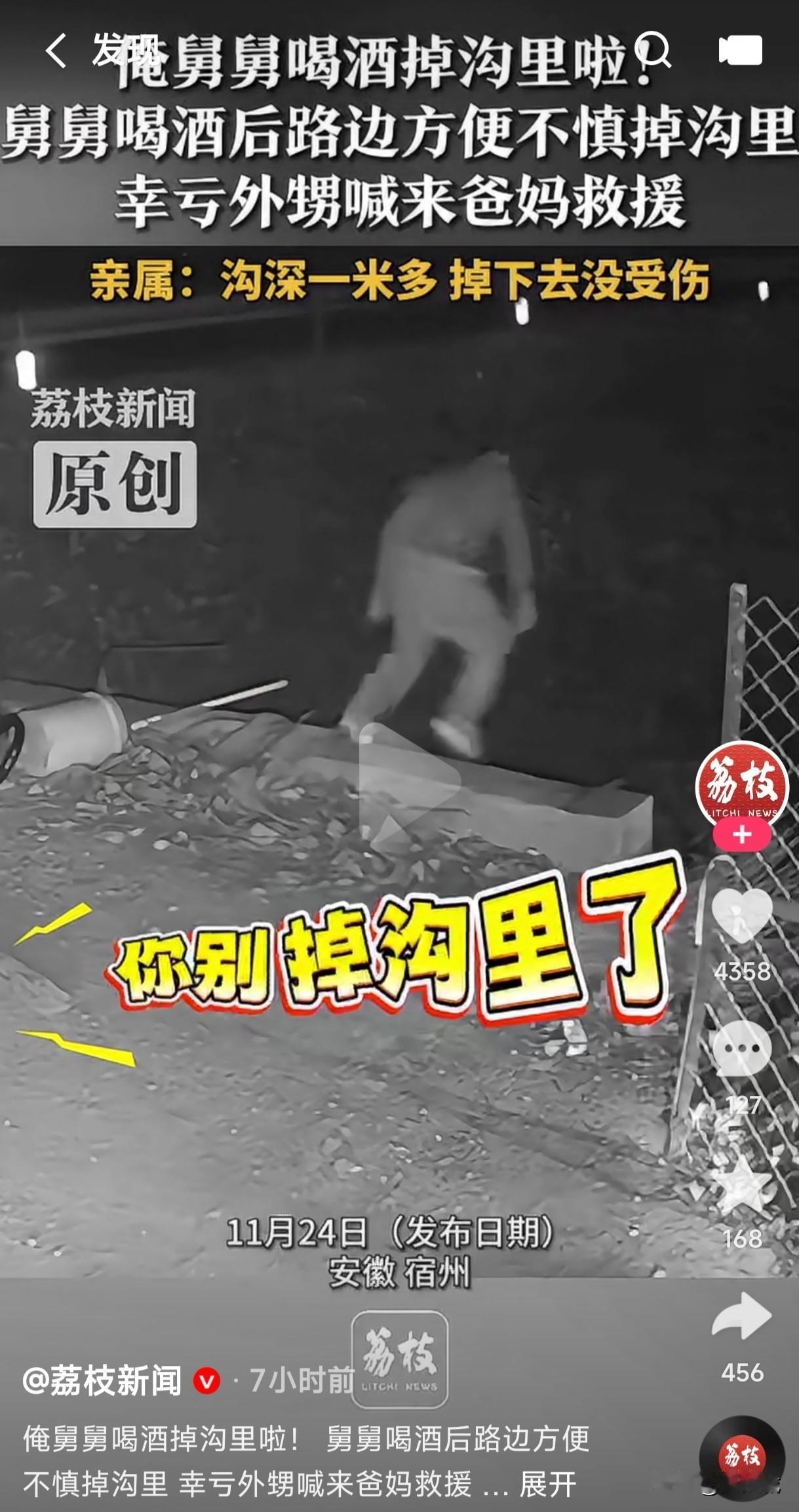 舅舅喝多后去路边方便,外甥紧跟其后说舅舅小心点不要掉沟里去了,外甥话音刚落舅舅就掉到了沟里,外甥又去喊爸妈来救援。 不知这舅舅是真喝多了,还是他故意不听外甥劝,外甥给他说小心点,小心点不要掉沟里去了,结果外甥话音刚落他就扑通一下掉进了沟里,外甥又着急的边喊父母边说俺舅掉沟里了,俺舅掉沟里了,幸亏这沟不深,这要是深点的话,那不得又摔的不轻。 老话说,不听老人言吃亏在眼前,这舅舅是酒后不听外甥劝,掉进沟里找救援,不知道这孩子舅舅救上来,以后还听不听他外甥的劝?
