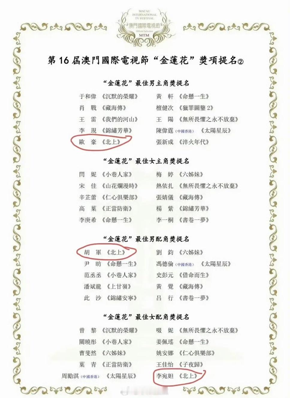 金莲花的提名名单一览所以,北上除了女主白鹿全提名了❓你们觉得这个提名含金量高吗?