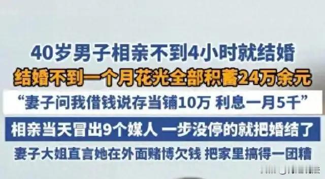 湖北,一个看似普通的城市角落,却上演了一场令人唏嘘的现实闹剧。40岁的姚先生,在相亲市场遇见了一个神秘女子。两人从初见到领证,不到4小时,飞速结婚,看似一段“快意人生”的传奇,却没想到,短短不到一个月时间,姚先生一辈子的积蓄全部化为乌有。背后的真相,却是让人震惊的骗婚阴谋。 在这个速食爱情盛行的时代,姚先生本以为遇到了属于自己的幸福,或许是命中注定的良缘。然而,现实却无情地撕开了这段感情的画皮。女子背负巨额债款,企图通过“虚假结婚”来规避债务,薅尽“羊毛”。利用姚先生的善良与信任,她迅速挥霍了所有的存款,甚至还想继续借贷扩充她的“坑”。 这不禁让人冷思:人心真的可以如此复杂吗?当“速成婚姻”变成陷阱,爱情是否还存在真正的纯粹?而面对这样的骗局,受害者的痛苦又该如何诉说?姚先生自责,也无奈,但他并不是唯一一个被套路的普通人。 这起案子揭示了社会一个不可忽视的角落——虚假婚姻和经济诈骗交织的灰色地带。背后反映的,是当代人们在情感与利益交织下的迷茫和焦虑。很多时候,我们急于寻找归属,却忽视了自我保护,给了骗子可乘之机。 网友们看后纷纷表示痛心:“这太现实了,现实生活中这样的人太多了。”“婚姻不能冲动,安全意识必须提升。”“希望姚先生能走出阴影,重新开始!” 这不仅仅是一起骗婚案件,更是一次对我们每个人的警醒。一纸婚书背后,是责任、信任与尊重。真正的感情,需要时间去沉淀和验证,而不是4小时的冲动决定。 荆门婚姻危机 随州婚姻相亲