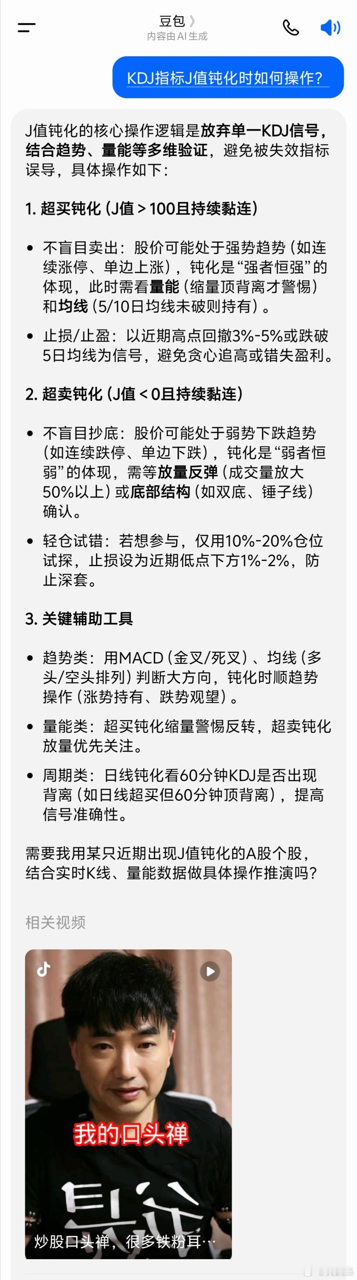 KDJ指标J值钝化后如何操作,豆包给出的答案,可以参考一下。(她也是截取了我的视频观点。)