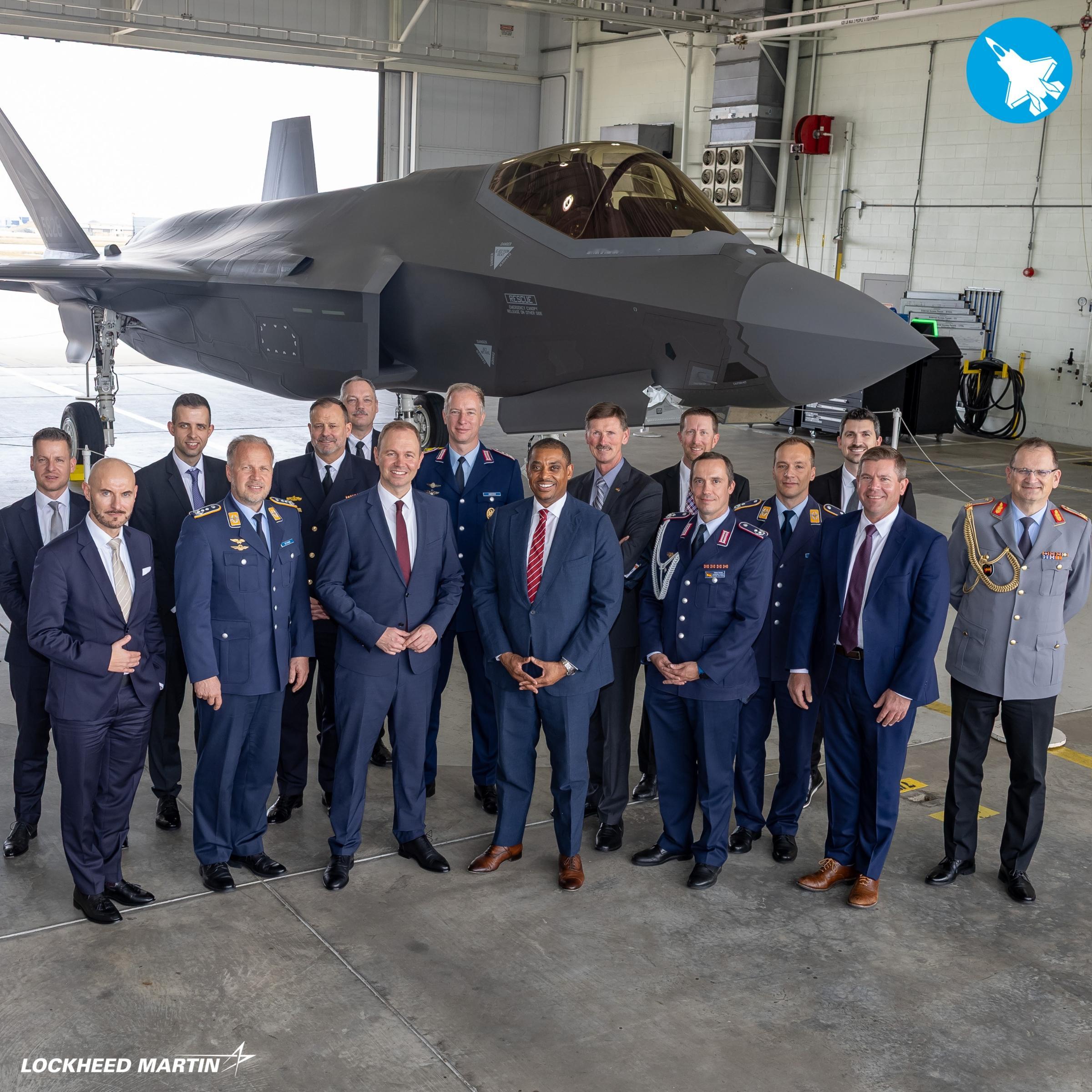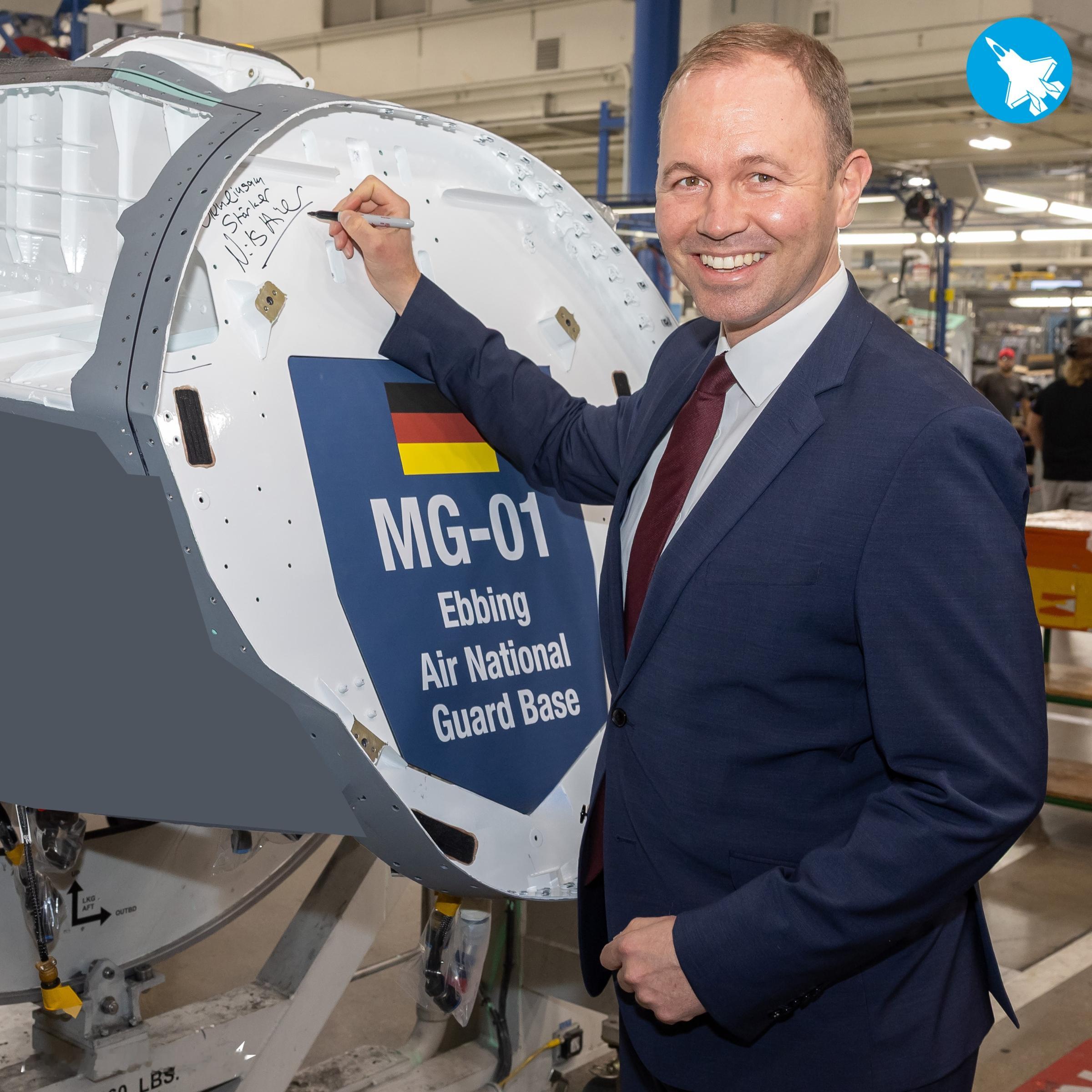 德国国务秘书尼尔斯·希尔默访问洛克希德·马丁沃斯堡生产基地,在德国首架F-35A战斗机机身上签名