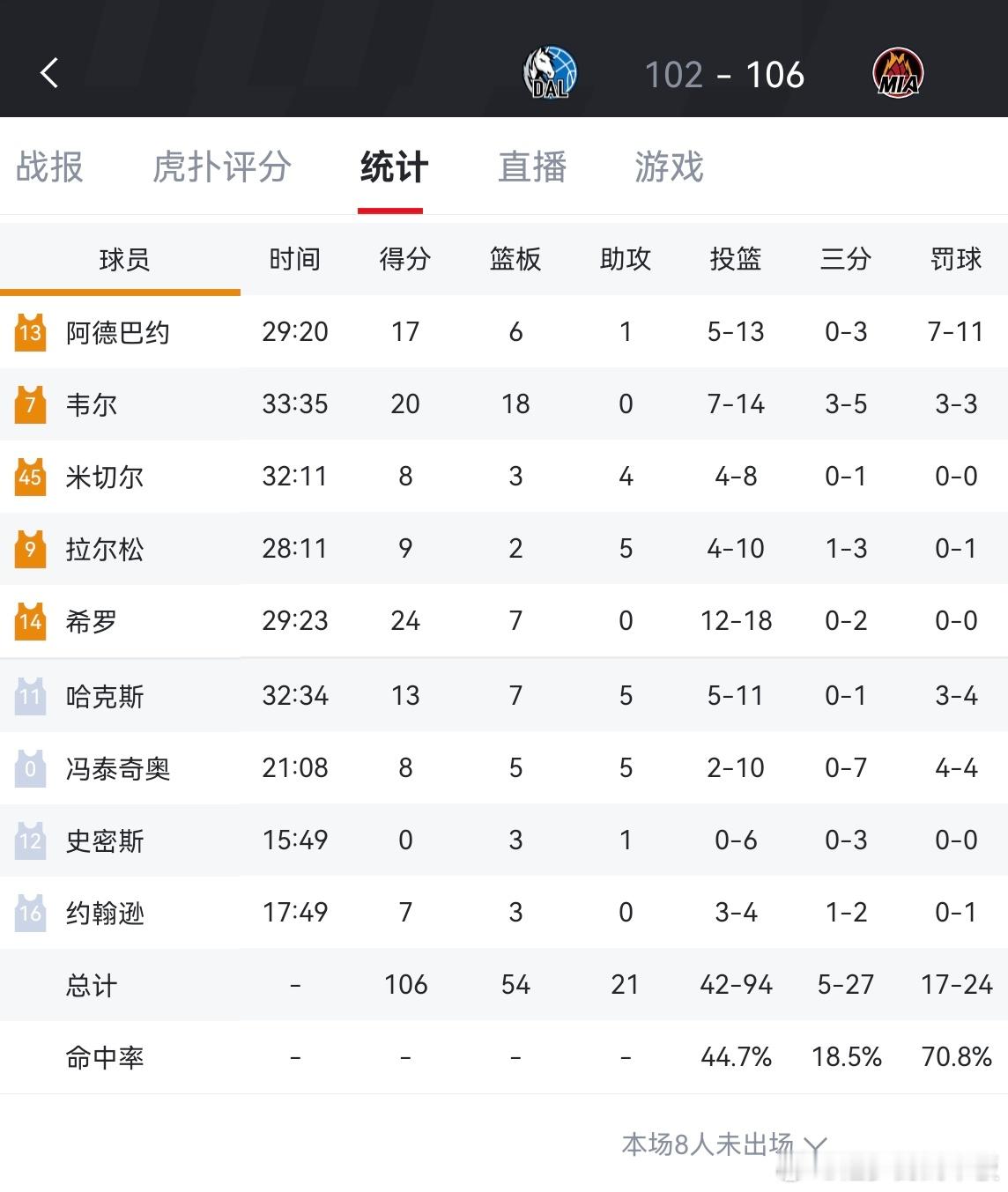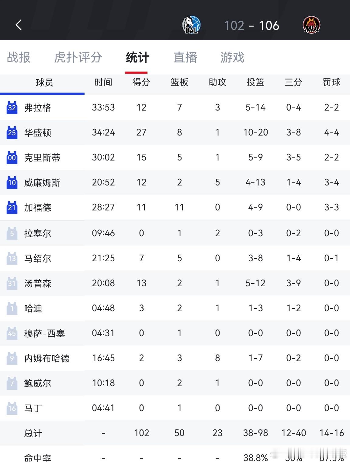 独行侠不敌热火,战绩5胜14负!弗拉格12分,PJ华盛顿27分,希罗24分,凯尔维尔20分18板
