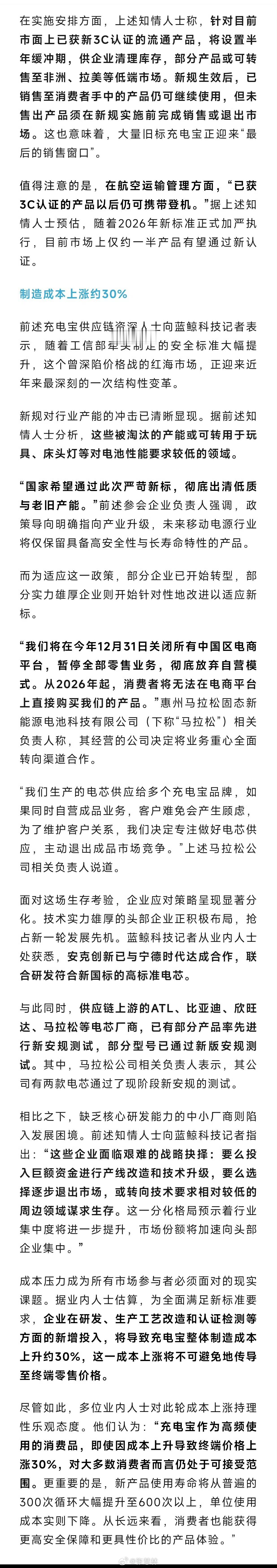 为筑牢移动电源安全防线,规范行业高质量发展,工信部于近期多次组织召开《移动电源安全技术规范》征求意见稿研讨会,经过三四轮深度研讨,该强制性国家标准已基本定稿。据悉,新规预计12月公示,2026年2月正式发布,同年6月起全面实施,届时原有3C认证规定将全面失效。相较于旧标准,新规堪称"史上最严",在整机、线路板和电芯三大核心领域推出数十项严苛技术改进。整机层面明确要求外壳必须标注"建议使用寿命"及代工厂全称,强化产品溯源与信息透明;线路板强制配备LCD屏幕或联网APP,可实时显示电池健康度、使用次数等关键参数,破解传统设备"信息黑箱"难题;电芯部分则升级多项安全测试,包括加严针刺测试、将热滥用测试条件提升至135℃六十分钟、过充电测试电压提高至规定电压的1.4倍,从源头遏制热失控风险。此次标准升级不仅是技术层面的革新,更是对行业的全面"大考"。数据显示,近年来充电宝自燃、爆炸等安全事故频发,仅2024年境内航班就发生37起移动电源自燃事件,81%涉及未获3C认证的劣质产品。新规实施后,预计近七成现有产能因无法满足技术要求将被迫退出市场,行业将迎来深度洗牌。尽管企业研发与生产投入增加可能导致终端价格小幅上涨,但新产品循环使用寿命将从300次大幅提升至600次以上,既保障消费者生命财产安全,也推动行业从"价格战"转向"安全战",实现高质量升级。行业格局重塑已箭在弦上,消费者未来选购移动电源需关注新标准认证标识,共同拥抱更安全、更可靠的产品生态。