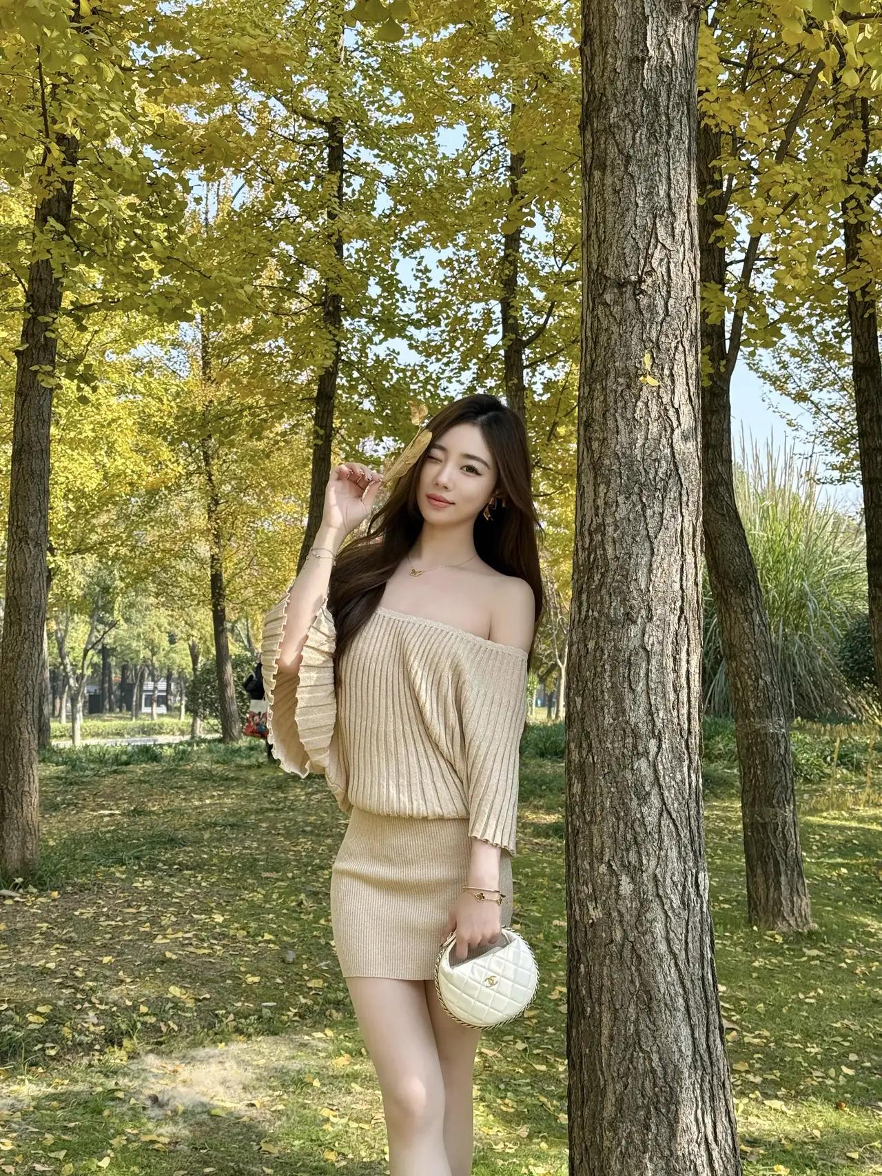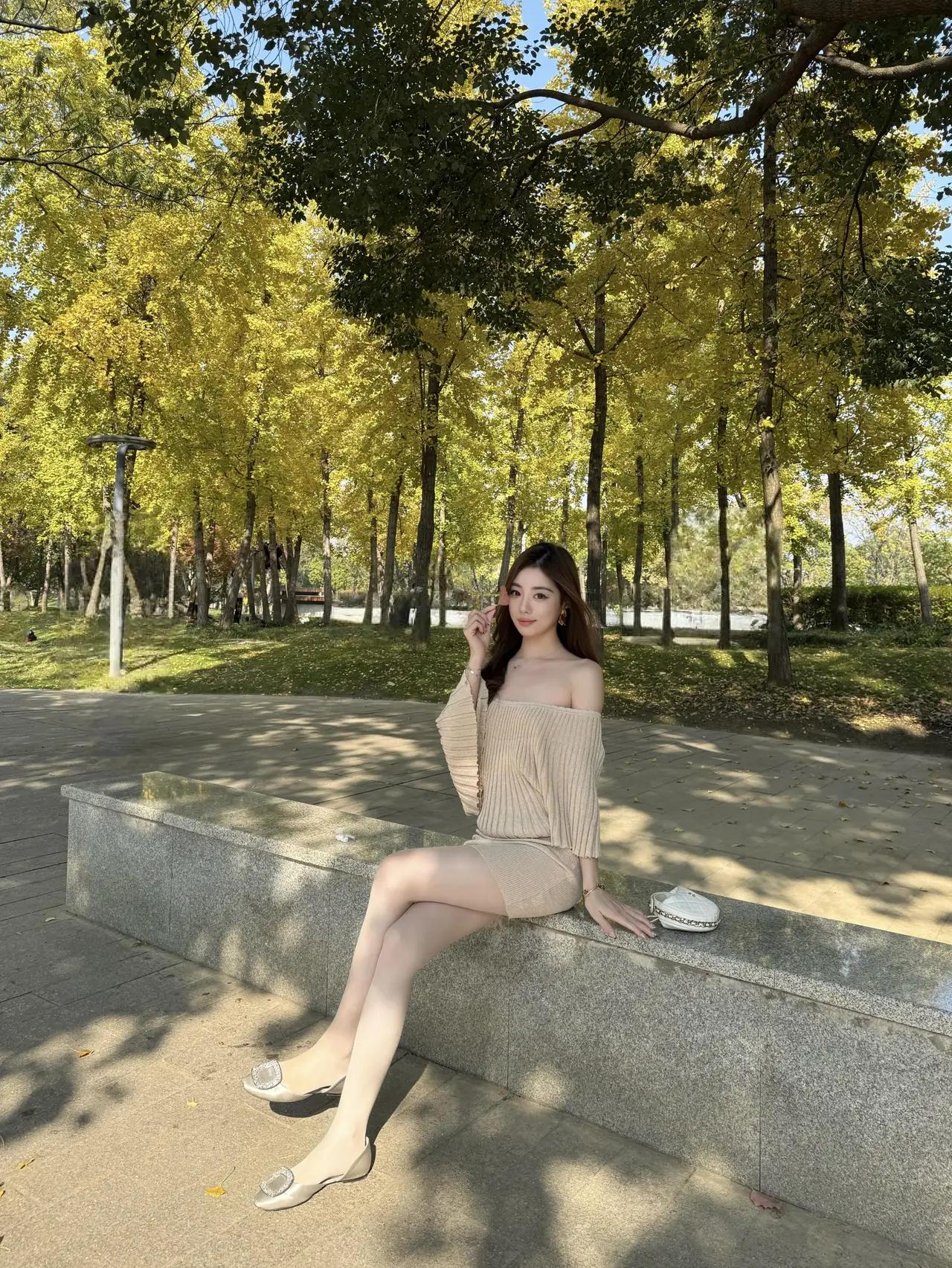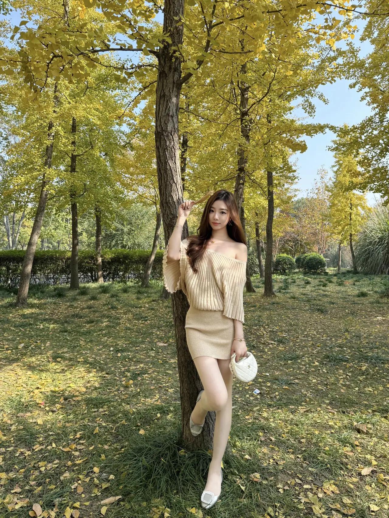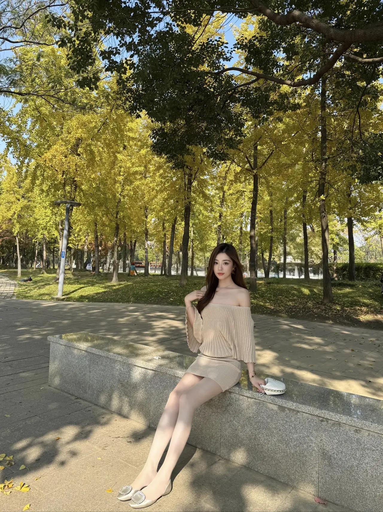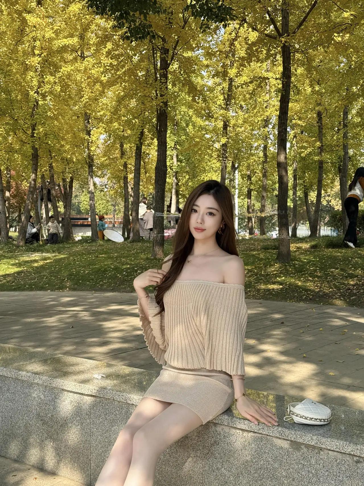 深秋的午后,阳光如碎金般洒落在林间小径上。石板路上铺满金黄的落叶,踩上去发出细碎的声响,仿佛大地在低语。一位女子斜倚在青石栏杆上,米色针织上衣勾勒出她纤细的肩线,裙摆随风轻扬,与身后斑驳的树影交织成一幅油画。她托腮凝望远方,指尖无意识摩挲着栏杆上的苔痕,像是要将时光的褶皱轻轻抚平。 风过处,几片枫叶打着旋儿落在她脚边。她俯身拾起一片,叶脉间还凝着晨露的痕迹,恍若捧起一整个季节的私语。远处林鸟啁啾,近处光影流转,连空气里都浮动着草木的甘洌。这一刻,喧嚣褪去,唯有自然与她共享这份静谧。 夕阳渐沉,天边晕染开橘粉色的霞光。她起身时,裙裾扫过石板上的落叶,窸窣声惊起一只藏在灌木丛中的松鼠。望着那小生灵慌不择路的背影,她忽然轻笑出声——原来秋日从不寂寥,它只是将热闹藏进了每片叶的纹路、每缕风的呼吸里。 暮色四合时,她踩着满地碎金离去,背影融进暮霭,却把一整个秋天的温柔留在了身后的小径上。
