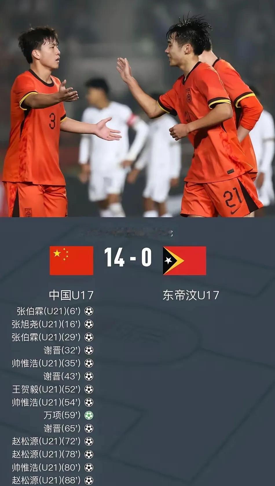 中国足球星星之火可以燎原!中国U16国少制造中国足球第二大比分胜利,中国U16国少14比0东帝汶,中国队第一大比分还是2000年1月26日亚洲杯预选赛上,中国队以19比0大胜关岛队,这是其国际A级赛事的队史最大赢球纪录,今晚中国U16国少再创14比0的第二大比分纪录,真的是太强势了。 上次是2015年11月12日世界杯亚洲区40强赛中,中国队12比0大胜不丹队,今晚2025年11月24日中国U16国少打破第二大进球纪录,这批中国U16新星井喷涌现,一场比赛7人进球,3人上演帽子戏法,1人梅开二度,真的太强了,下面中国队对文莱U17有望打破19球纪录,让我们拭目以待吧! 希望中国U16国少再接再厉,赢下下面所有比赛,小组第一名晋级U17亚洲杯正赛,中国U16国少加油!