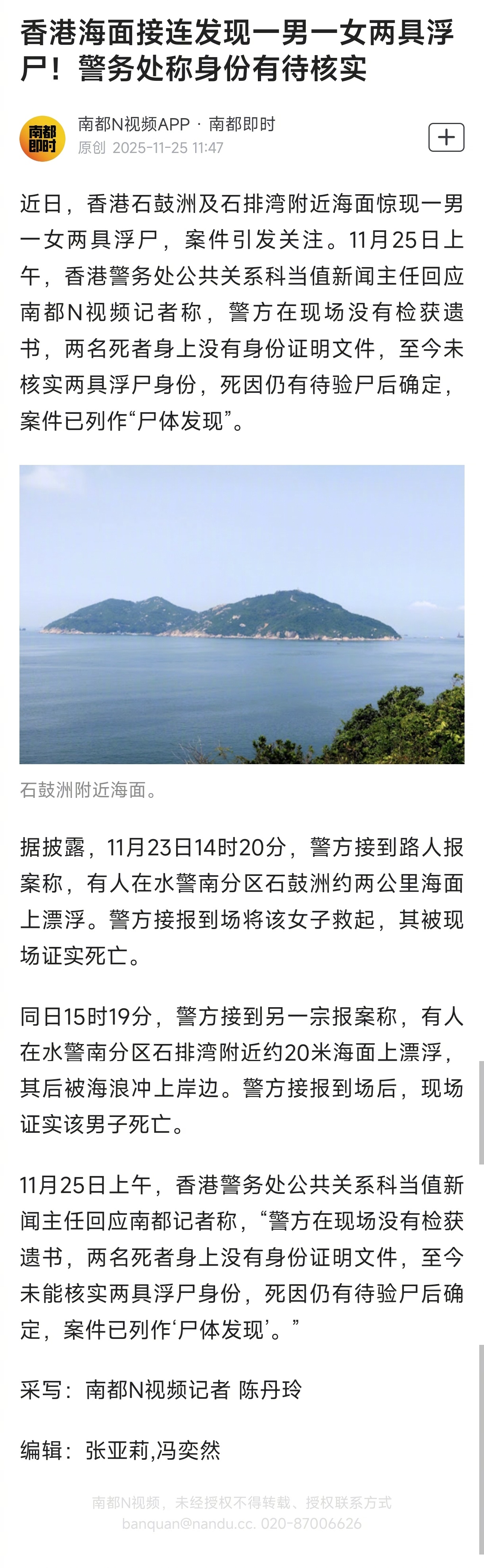 【香港海岛附近接连发现一男一女两具浮尸!警方称仍未核实身份】近日,香港石鼓洲及石排湾附近海面惊现一男一女两具浮尸,案件引发关注。11月25日上午,香港警务处公共关系科当值新闻主任回应南都N视频记者称,警方在现场没有检获遗书,两名死者身上没有身份证明文件,至今未核实两具浮尸身份,死因仍有待验尸后确定,案件已列作“尸体发现”。据披露,11月23日14时20分,警方接到路人报案称,有人在水警南分区石鼓洲约两公里海面上漂浮。警方接报到场将该女子救起,其被现场证实死亡。同日15时19分,警方接到另一宗报案称,有人在水警南分区石排湾附近约20米海面上漂浮,其后被海浪冲上岸边。警方接报到场后,现场证实该男子死亡。(南都N视频记者 陈丹玲)
