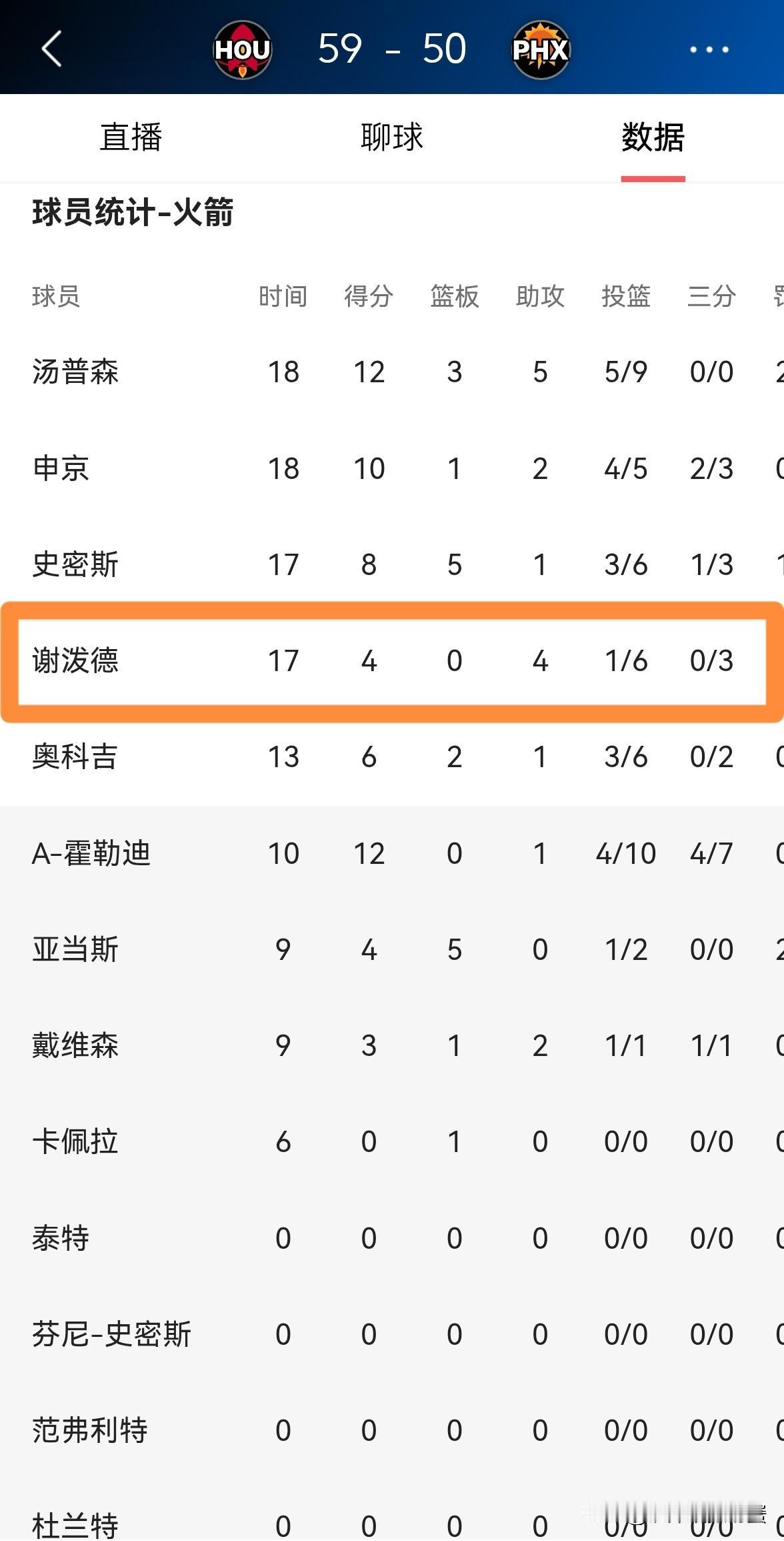 火箭超级新星谢波德真不适合打首发!在今天火箭客场挑战太阳的比赛中,目前双方的上半场比赛已经结束,火箭以59:50领先对手。让人感到无比失望的是,本场比赛首发出战的谢波德在进攻端的表现极其糟糕。 在前两节比赛中,谢波德首发出战17分钟,投篮6中1,其中三分球3中0、罚球2中2仅仅得到4分。 事实证明,谢波德还不具备打首发的能力,他更适合打替补,因为当他打替补时,他面对的防守压力更小。