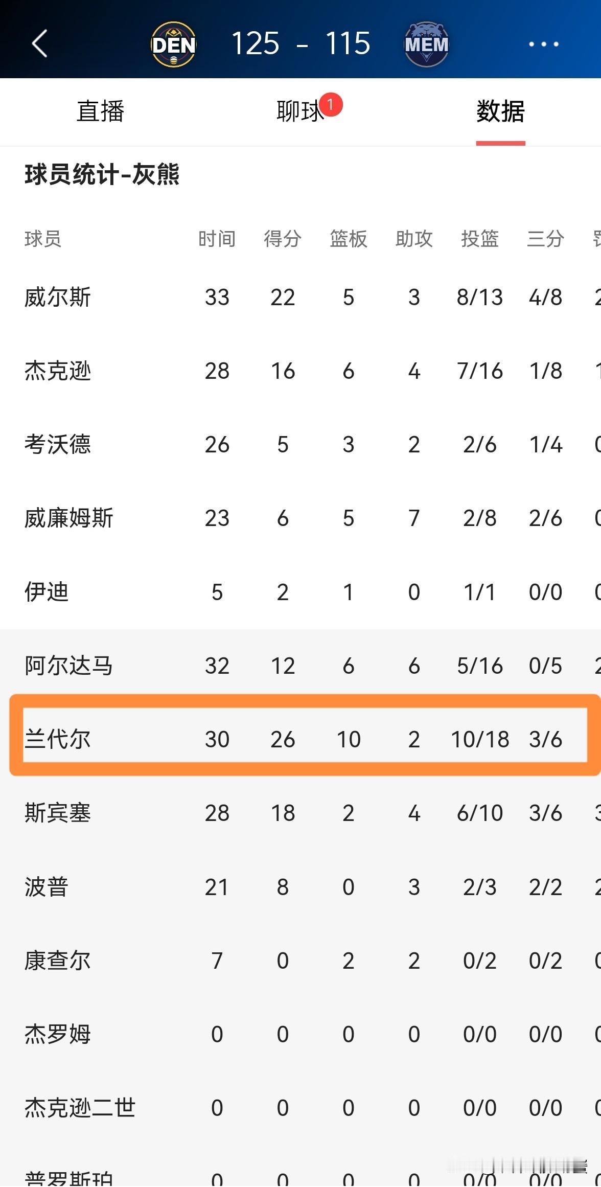灰熊替补中锋兰代尔真是一战成名!虽然今天灰熊在主场以115:125输给了掘金,但是兰代尔的表现却非常出色,他在和超级巨星约基奇的对位中丝毫不落下风。 整场比赛下来,兰代尔替补出战30分钟,投篮18中10,其中三分球6中3、罚球3中3非常高效的砍下26分10篮板。 在我看来,此役兰代尔打出了本赛季开赛以来的最佳表现,更重要的是他是在面对约基奇时打出了这样的表现。