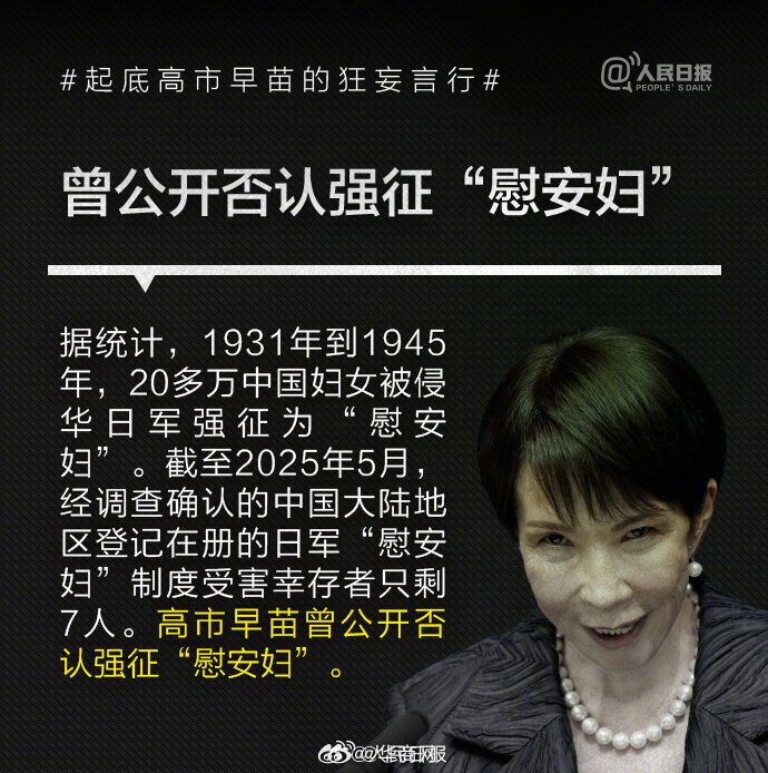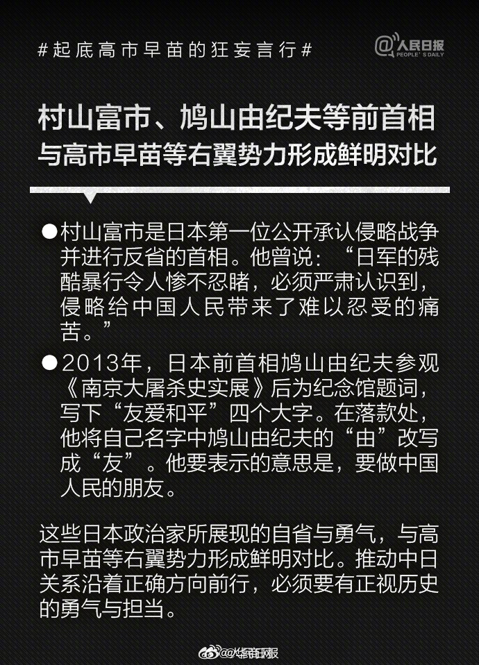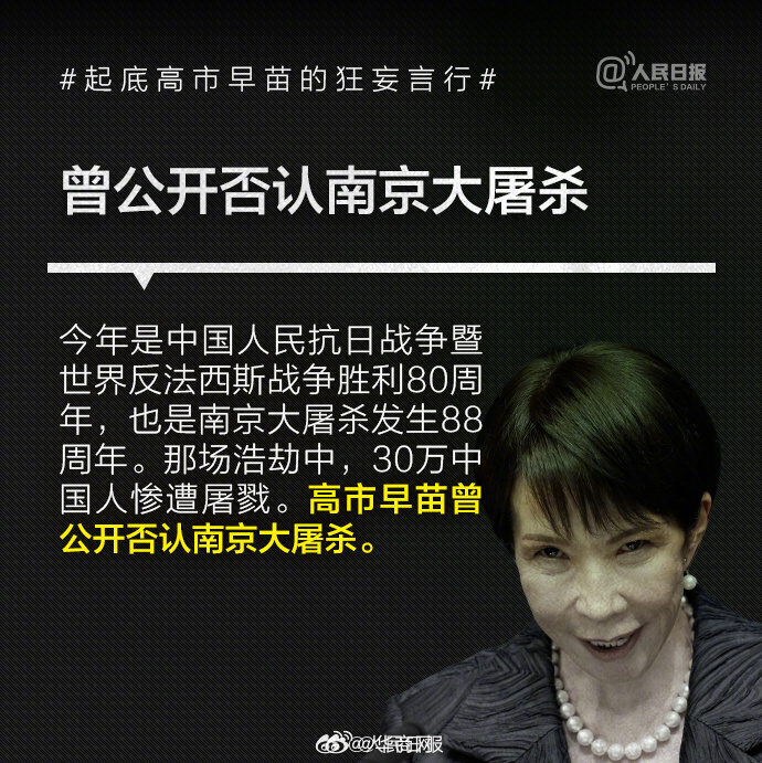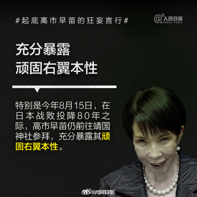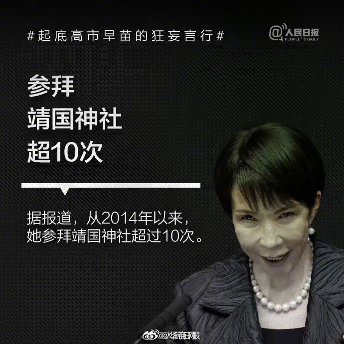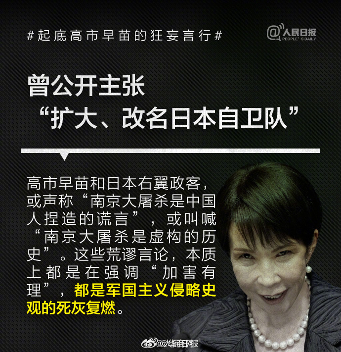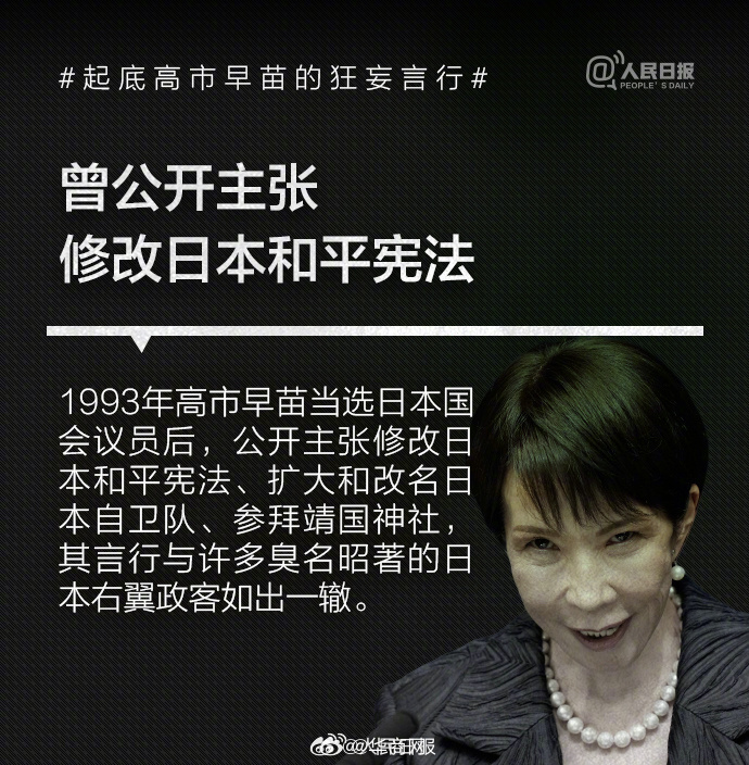 1993年高市早苗当选日本国会议员后,公开主张修改日本和平宪法、扩大和改名日本自卫队、参拜靖国神社,其言行与许多臭名昭著的日本右翼政客如出一辙。。历史的教训岂敢忘却!我们绝不允许日本军国主义复活,破坏世界和平稳定。(人民日报)