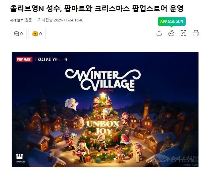 【韩国Olive Young N 圣水店携手泡泡玛特推出圣诞快闪店】 CJ Olive Young 与 POP MART Korea 联手,于 12 月在 Olive Young N 圣水店运营“2025 Olive Young Awards l POP MART”圣诞快闪店。快闪店以“POP MART 冬季村庄”为主题,重现圣诞小镇场景,POP MART 圣诞限定系列由“星星人”“LABUBU”“Crybaby”“DIMOO”“Molly”“HIRONO”“Skullpanda”等 7 大热门角色组成,将推出 LABUBU 手办、Crybaby 手机挂绳、星星人笔记本等约 100 款潮流商品。现场设有丰富互动体验,包括印章巡游任务、寻找最适合自己的奖品、写下圣诞心愿投递邮筒,以及拍照打卡、话题标签挑战等活动。访客可根据任务完成情况获得手办、钥匙扣等特别礼品,部分活动还将抽送惊喜礼物。Olive Young N 圣水店自开业一年以来,已成为吸引国内外访客的 K-Beauty 与 K-Lifestyle 快闪店热点。此前推出的“美迪惠尔 X KBO”和“Legote 随心装饰随身杯”快闪店均获得超过万名访客打卡的热烈反响。Olive Young 表示,将持续与各大品牌合作,打造差异化体验,为顾客提供更丰富的节日体验。