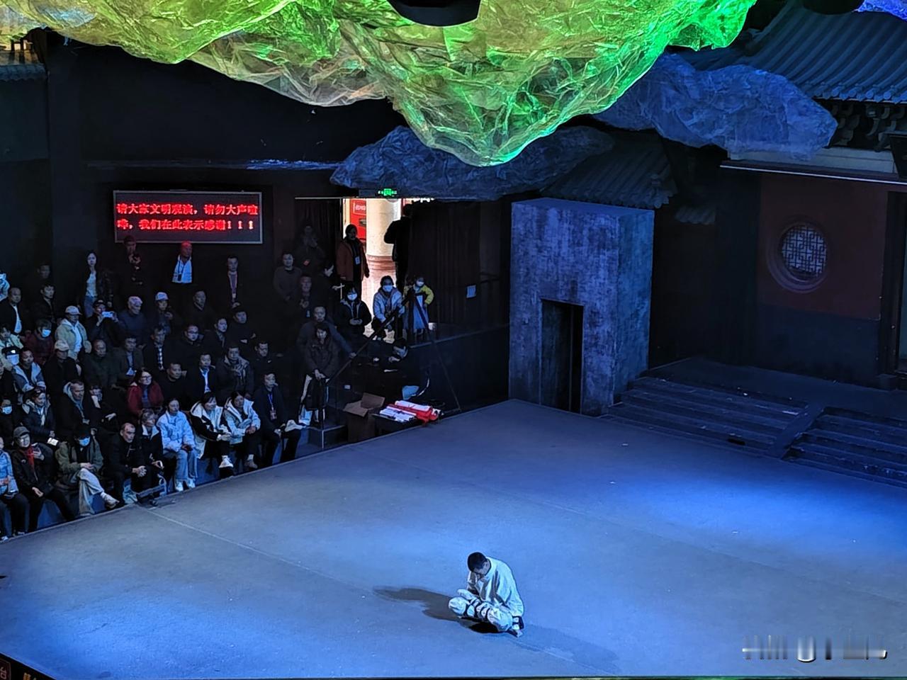 看这现场,台上演员蜷着身子沉浸式表演,台下观众挤得满满当当,连过道都坐了人~头顶那抹绿光裹着的装置还挺有氛围感,旁边墙上的提示牌还在喊“文明观演别大声”,不过看这阵仗,大家注意力早被舞台勾走啦!这种近距离看表演的感觉真不一样,演员的小动作都看得清清楚楚,连空气里都透着专注,这现场代入感也太强了! 要不要我帮你提炼一下这场演出的氛围亮点?