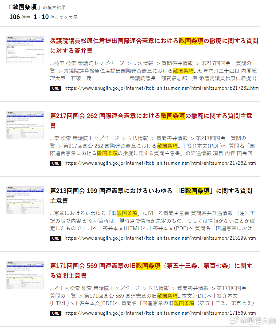有人说“敌国条款”已经被废除了是怎么回事呢?这是对1995年联合国大会通过的“A/RES/50/52号决议”的曲解。我也特意去看了这个决议的原文内容。这个决议是1995年12月11日,在联合国大会第87次全体会议上通过的。其中提到:“注意到特别委员会对删除《联合国宪章》第五十三、第七十七和第一百零七条中的“敌国”条款的问题方面应采取的最适当法律行动提出的建议,认识到世界已发生很大变化,因而《联合国宪章》第五十三、第七十七和第一百零七条中的“敌国”条款已经过时。”这里需要注意,联合国该决议的英文原文使用的是“obsolete”。这个词可以翻译为“过时”,也可以翻译为“废除”。但在这里,结合上下文语境,只能翻译为“过时”。因为联合国大会并没有权力“废除”敌国条款。要“废除敌国条款”,需要修改《联合国宪章》。按照《联合国宪章》第108条规定,本宪章之修正案经大会会员国三分之二表决并由联合国会员国三分之二、包括安全理事会全体常任理事国,各依其宪法程序批准后,对于联合国所有会员国发生效力。这个修改条件还是比较苛刻的。所以,这里联合国大会的决议,只能说敌国条款“过时”,而不能说敌国条款已经废除。而且,联合国网站上该决议的中文版本,也是写着“过时”。中文作为联合国官方语言,中文版本怎么写,已经说明了一切。但日本方面一直把“obsolete”翻译为“废除”,属于日本方面一厢情愿的想法,也是日本搞舆论战的一环。因为日本是最想把联合国敌国条款废除的国家。二战的三个“敌国”,意大利只是打酱油的,德国和日本是法西斯主力,其中德国在二战后已经深刻反省,唯独日本从未真正反省其对外侵略历史,还在不断美化侵略历史,从未被真正清算,存在军国主义死灰复燃的问题。正因为如此,日本长期以来一直在推动废除《联合国宪章》的敌国条款。但直到现在,《联合国宪章》中的敌国条款,仍然没有被废除。1995年的联合国决议,仅仅只是“建议废除”。其中提到:“考虑到修改《宪章》所涉过程非常复杂,1. 注意到联合国宪章和加强联合国作用特别委员会的报告;2. 决定特别委员会于1996年2月21日至3月5日召开其下一届会议;3. 表示打算启用《联合国宪章》第一百零八条所述的程序,在今后尽可能早的一届适当的会议上对《 宪章》作出预期将来生效的修正,把第五十三、第七十七和第一百零七条中的“敌国”条款删除。然而1996年并没有完成对《联合国宪章》的敌国条款删除。显然由于日本从未真正反省历史,让不少国家担心日本存在重回军国主义对外侵略的可能性,所以《联合国宪章》的敌国条款在1996年删除失败。所以,直到今日《联合国宪章》的敌国条款仍然存在,那么就意味着敌国条款仍然有效,不存在被废除。一直到2025年6月24日,日本众议院议员都还在质询日本首相石破茂,废除联合国宪章中的敌国条款的进度。要是真废除了,日本议员也不至于隔三差五就去质询日本首相,为何还没有废除。