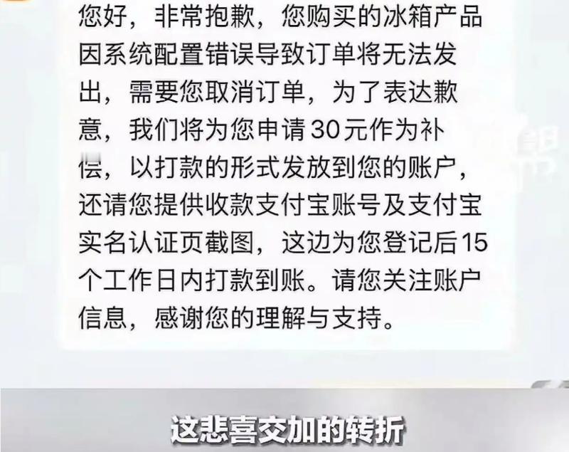 [太阳]11月23日报道,河南,男子花11.11元秒杀小米冰箱,付款成功后不发货。店铺:系统配置错误,给你30元红包!男子:把我当要饭的? (信息来源:红星新闻——男子11.11元秒杀小米冰箱遭拒发,客服回应:系统配置错误,补偿30元!网购平台解释) 河南安阳的张先生最近心里堵得慌,双十一熬夜蹲点抢福利的兴奋劲儿,全被一条取消订单的短信浇得透心凉。 市面上售价千元以上的小米冰箱,电商平台标出11.11元的秒杀价,这让他瞬间心动。为提高抢购成功率,他前前后后蹲守了好几天,不仅在手机上设置多重闹钟,每次秒杀前还特意关掉无线网,切换到流量网络,就怕网络卡顿错过这转瞬即逝的机会。 在一次激烈的抢购中,张先生凭借精准操作成功突围,完成下单并支付,订单页面显示“下单成功,等待发货”的那一刻,他立刻把这个好消息分享给家人,满心期待着冰箱送货上门。 可接下来的几天里,张先生每天登录平台查看订单状态,始终没能等到物流信息更新。就在他以为是双十一物流繁忙导致延迟时,一条短信让他的期待彻底落空。 商家以“系统配置错误”为由,单方面取消了他的订单,款项将原路退回。张先生越想越气,“这不是白忙活一场吗?” 商家后来提出的30元红包补偿,他压根不稀罕,毕竟耗费了那么多时间和精力蹲点,好不容易抢到的冰箱,说取消就取消,换谁都难以接受。 在他看来,自己正常下单、按时付款,整个交易流程完全合规,商家所谓的“系统配置错误”是他们自己的问题,凭什么要让消费者来承担损失。 带着张先生的疑问,记者联系了客服,对方证实了此次秒杀活动中确实出现了系统问题,导致相关冰箱订单无法正常发出。 可当被追问具体是哪种系统配置错误时,客服仅含糊回应,对于发货诉求,更是把皮球踢给了平台,称需要消费者自行联系购物平台协商处理。 这种推卸责任的答复让张先生更加不满,明明下了单,付款也直接支付给商家,现在出了问题却让消费者找平台,这显然说不过去。 随后,记者又联系上平台,工作人员给出的说法与小米客服有所不同。 平台表示,按正常的交易规则,消费者成功下单并付款后,买卖合同就已成立,卖家应按约定发货,即便真的是商品标价错误或系统配置问题,也不能成为单方面取消订单的理由。 不过工作人员也坦言,11.11元的成交价远低于产品成本价,不排除卖家宁愿接受平台处罚,也不愿亏本发货的可能,毕竟处罚金额可能远低于履约带来的亏损。 目前平台正在积极协调,但尚未取得实质性进展。这起纠纷很快引发了网友的广泛讨论,不少有过类似经历的网友纷纷留言吐槽。 有人说自己曾以22元的低价下单了原价数百元的衣物,结果被商家自动退单退款,客服同样只愿意补偿30元。 网友有的支持张先生,认为商家既然发起促销活动,消费者遵守规则完成抢购,就应当履行约定,单方面“砍单”既违背诚信,也损害品牌公信力。 还有的,则表示理解商家,觉得这样的低价明显超出正常促销范围,大概率是系统失误,商家亏损太大难以承受。 近年来电商促销中砍单事件屡见不鲜,从法律层面来看,商家在平台发布商品信息并明确价格,就构成法律意义上的要约,消费者成功下单付款即意味着同成立,商家应当发货。 张先生现在最希望的就是商家能正视问题,要么按照订单约定发货,要么给出合理的补偿方案,而不是用30元红包敷衍了事。 他表示自己并非非要较真这台冰箱,只是觉得商家的做法太不合理,如果协商无果,可能会通过法律途径维护自己的合法权益。 这起事件也折射出电商行业促销活动中的一个普遍问题:商家追求流量与消费者维护权益之间的矛盾。 商家开展秒杀活动本是吸引消费者的营销手段,但准备不足导致的系统错误,不该让消费者买单。即便出现问题,也应拿出更有诚意的解决方案,而非简单取消订单、敷衍了事。 消费者参与电商秒杀时要注意留存订单截图、聊天记录等相关证据,一旦遇到单方面取消订单等侵权行为,要及时向平台或相关部门投诉,依法维护自身权益。 毕竟诚信经营才是长久之道,一次不负责任的“砍单”,可能会失去一大批消费者的信任。