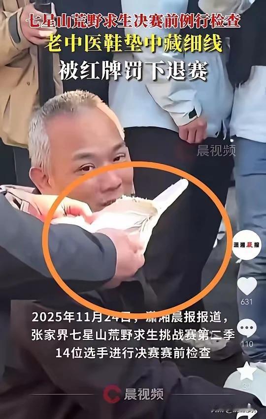 《荒野求生》老中医作弊退赛,这波操作真的又蠢又可惜! 赛前喊着“冲冠军拿20万”的豪言,转头就把细线缝进鞋垫夹带,想靠这暗招做陷阱捕猎物,结果被当场抓包亮红牌,全网围观社死现场。 其实公平早就摆在眼前了,节目组允许带少量衣服,还统一发了砍刀和登山靴,晋级就有3.2万,五天休息时间也给足了准备。 24小时安全员盯着,真以为这点小伎俩能逃过眼睛? 荒野求生比的不只是生存技巧,更是底线和体面。 一把年纪了,为了奖金丢了信誉,比输比赛还丢人。 有人说节目组该留面子私下处理,也有人觉得作弊就该严惩,你站哪一边? 如果是你,会为了奖金突破自己的底线吗?